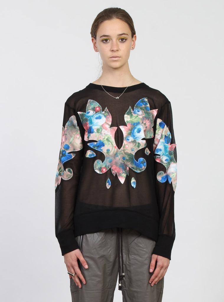 Relaxed fit crew, sheer chiffon front, sleeve and cuffs with sweatshirting back. Chiffon panels featuring cotrastng applique design.