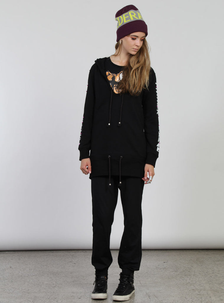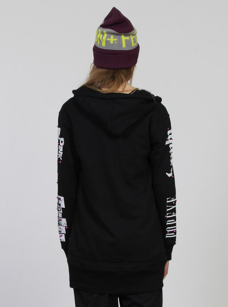Long sleeve pull over hoodie, low cut rounded v neck front with drawstring, featuring custom federation prints down arms and pearl detailing. +. Pip in left side seam.