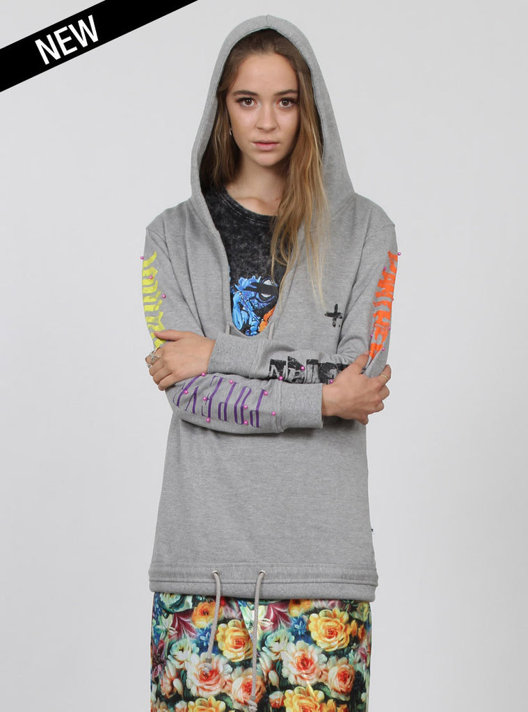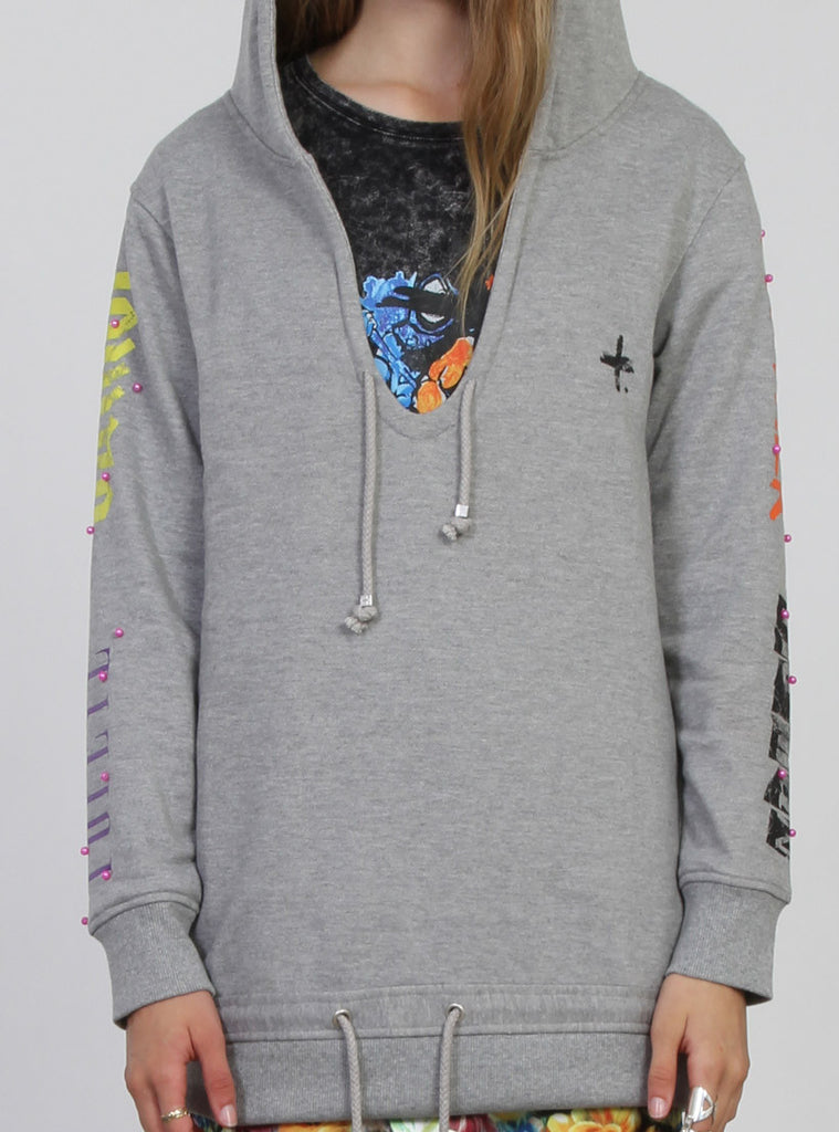 Long sleeve pull over hoodie, low cut rounded v neck front with drawstring, featuring custom federation prints down arms and pearl detailing. +. Pip in left side seam.