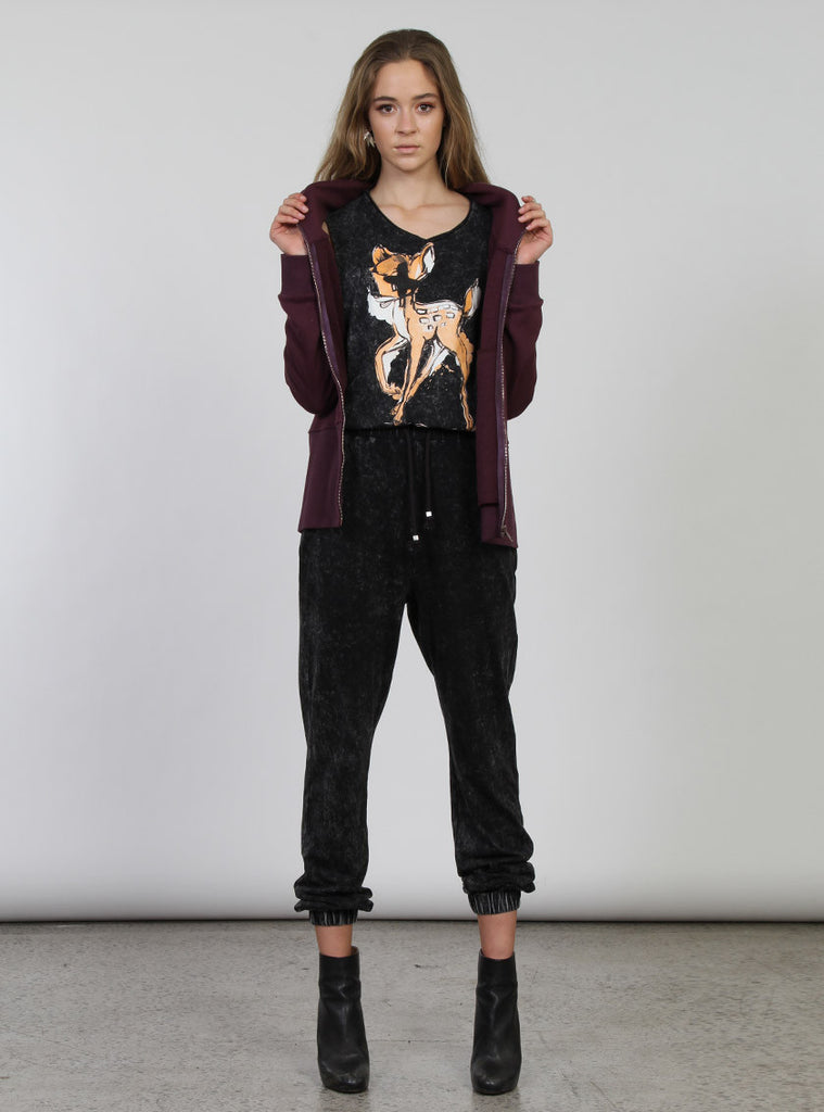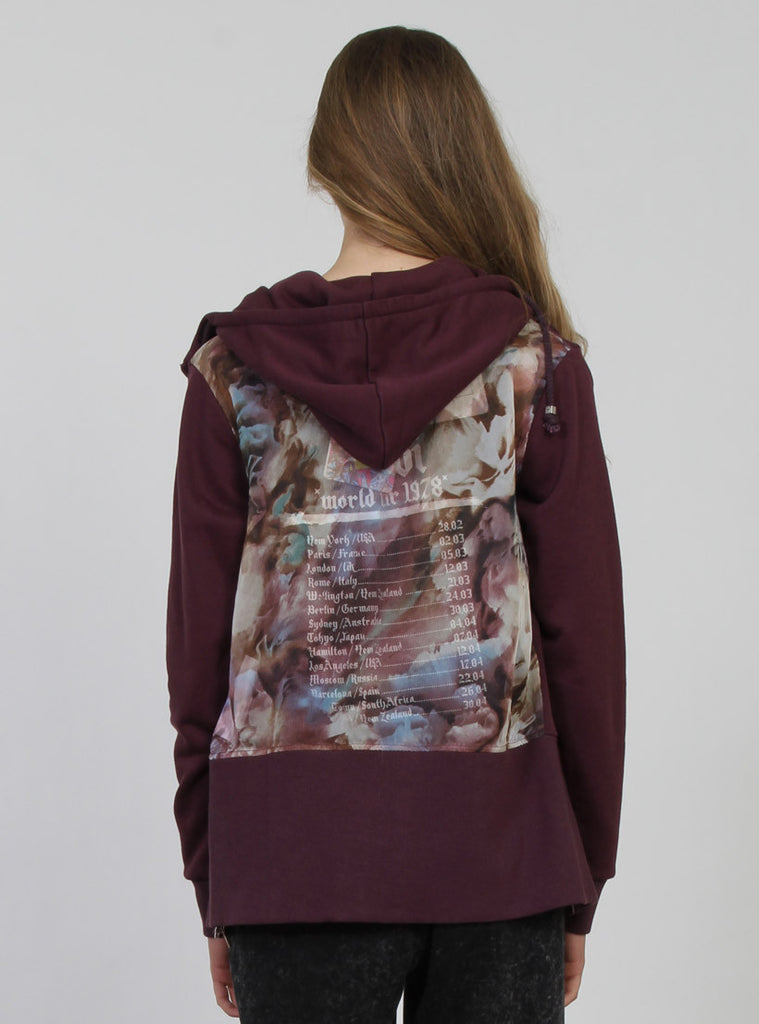 Long sleeve zip up high encapsulating hoodie with printed chiffon contrasting back panel. Rib cuff and hem, drawstring hood with metal +. Toggle and +. Pip in left side seam.