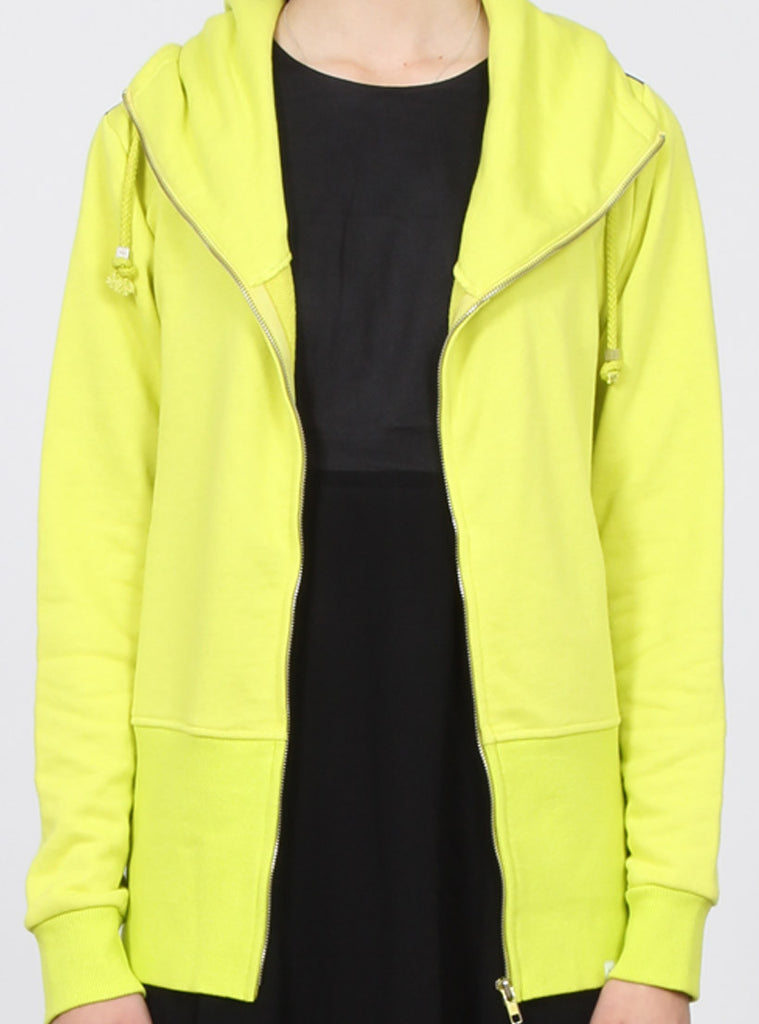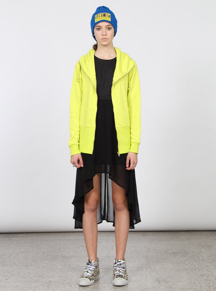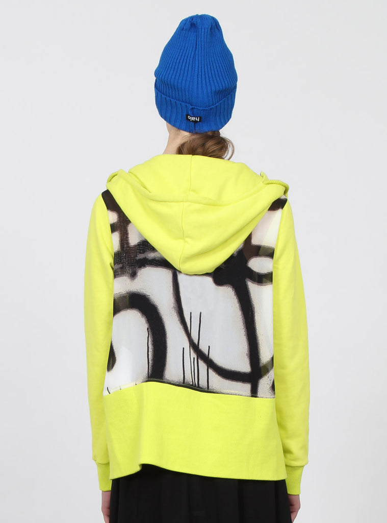 Long sleeve zip up high encapsulating hoodie with printed chiffon contrasting back panel. Rib cuff and hem, drawstring hood with metal +. toggle, and +. pip in left side seam.