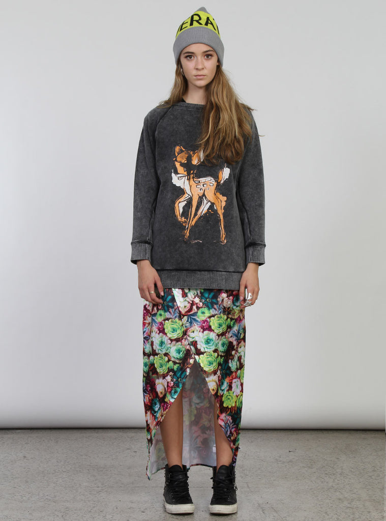 Womens relaxed fit long sleeve crew, rib cuff and neck. Federation custom print on centre front and distressing detailing. +. Pip in left side seam.