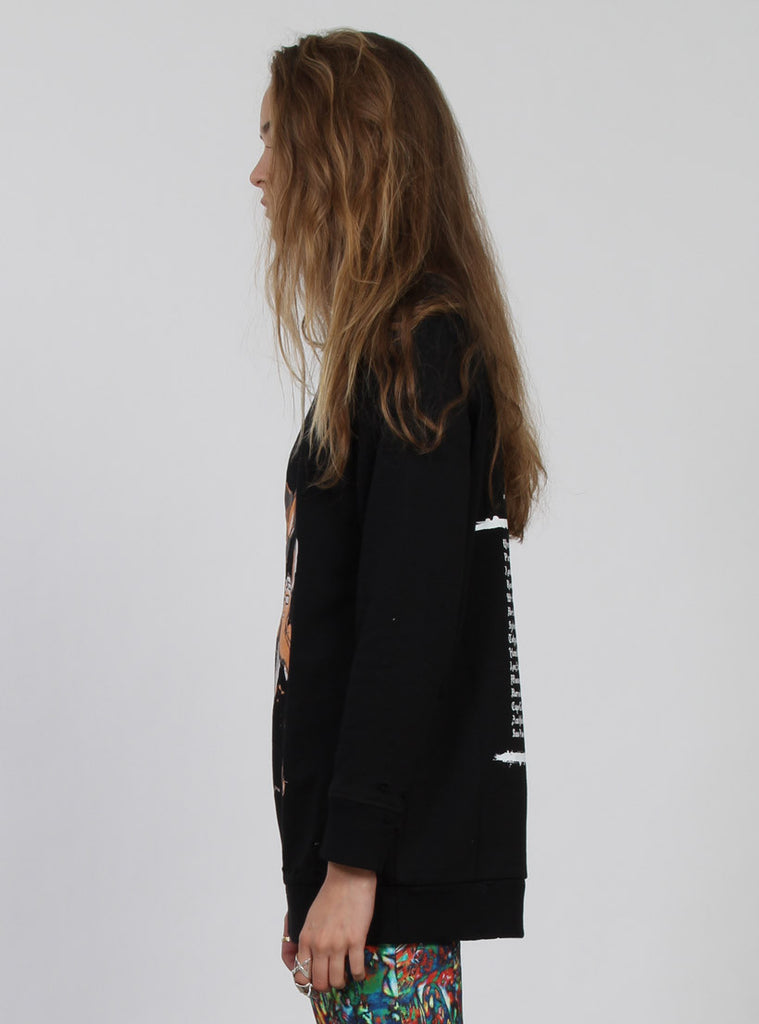 Womens relaxed fit long sleeve crew, rib cuff and neck. Federation custom print on centre front and distressing detailing. +. Pip in left side seam.