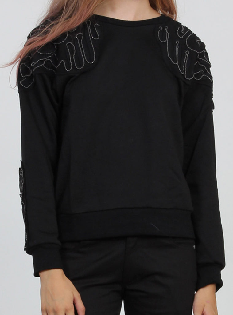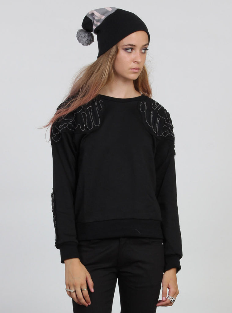 Raglan round ncek crew with 2x2 cotton rib cuff, hem and neck. Featuring metal applique patterned reverse jersey panels stitched onto top of front, back and sleeves. +. Pip in left side seam.