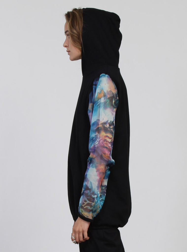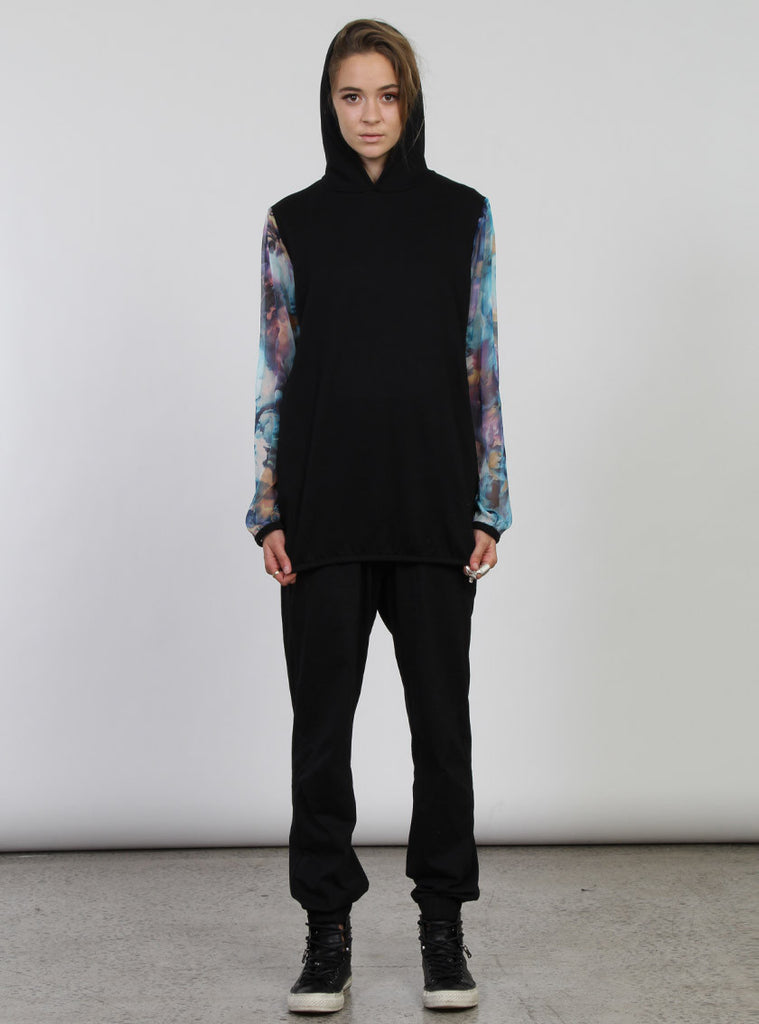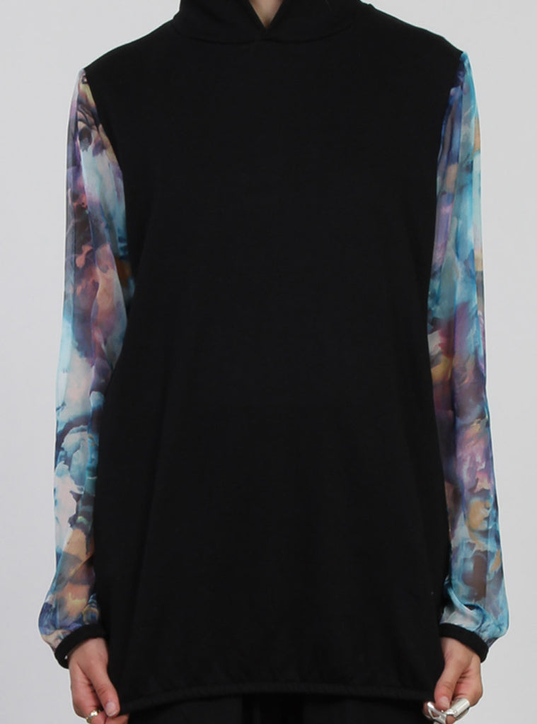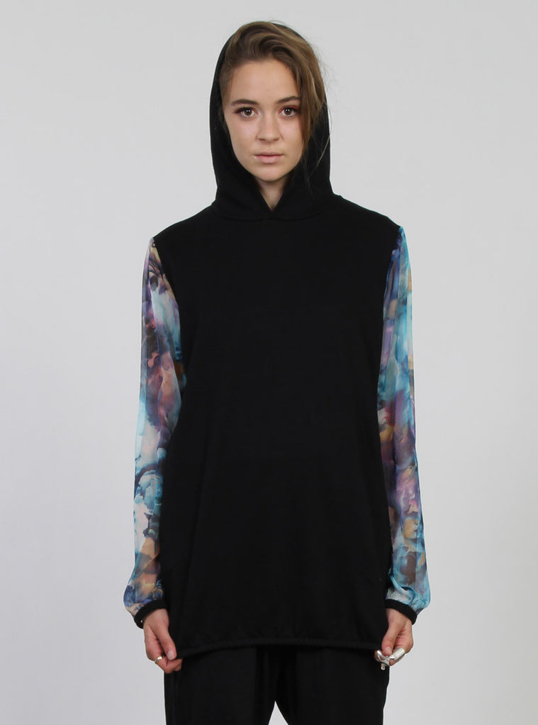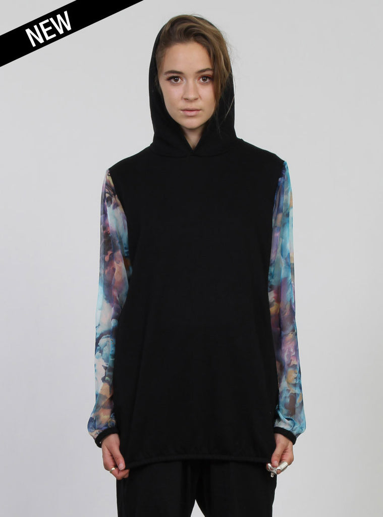 Long sleeve hooded jumper, sweatshirting body with contrasting chiffon sleeves. Long length with elasticated hem and +. Pip in left side seam.