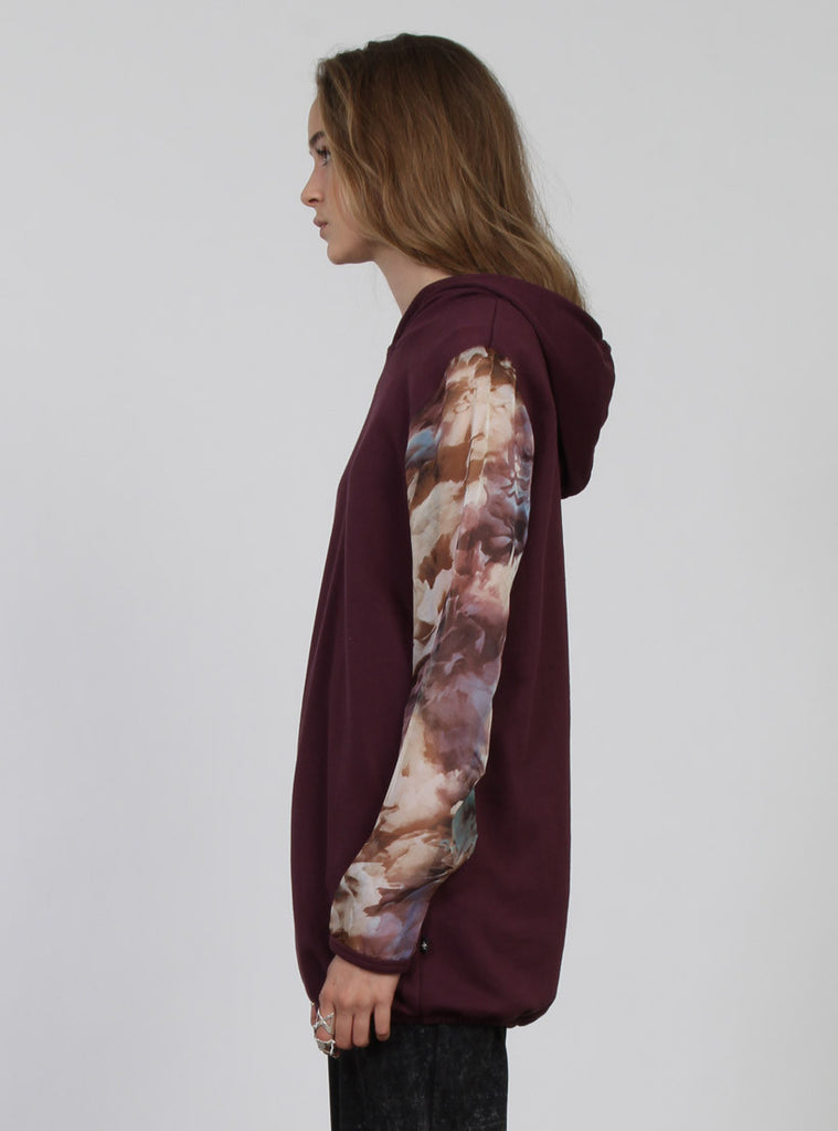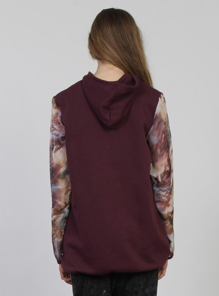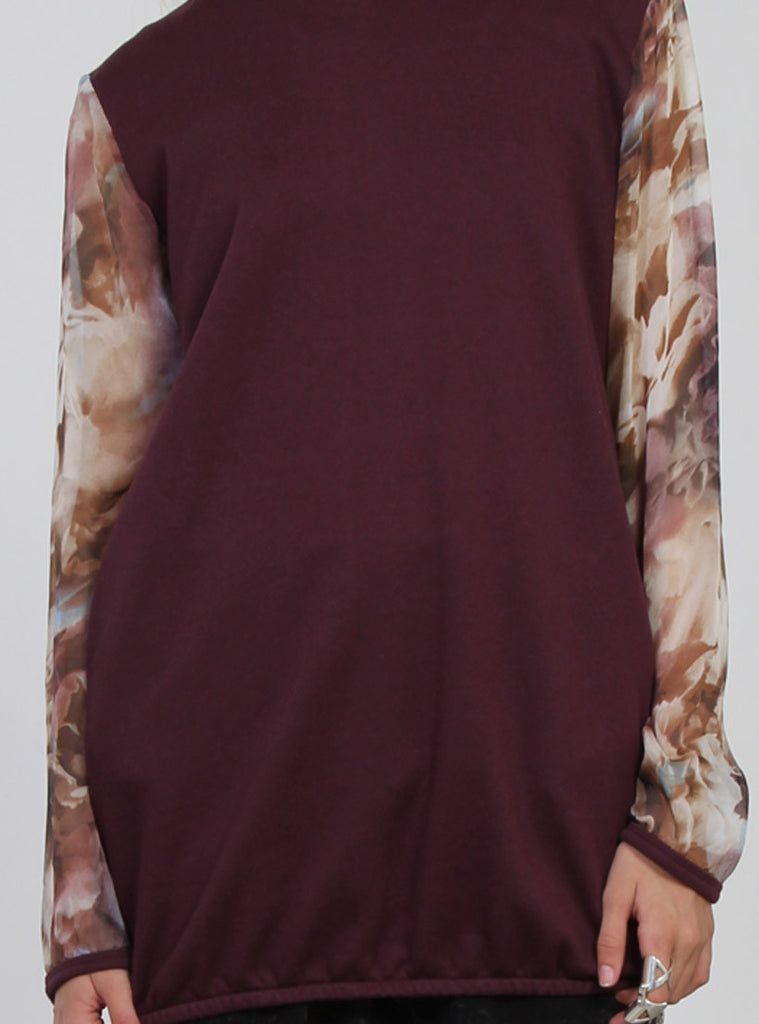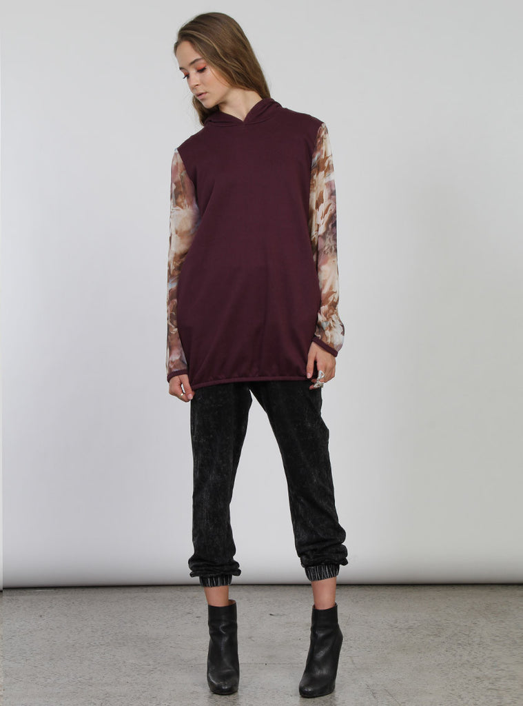 Long sleeve hooded jumper, sweatshirting body with contrasting chiffon sleeves. Long length with elasticated hem and +. Pip in left side seam.