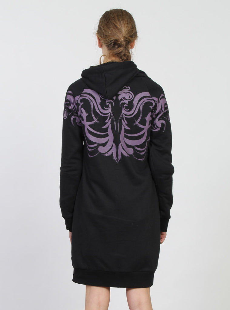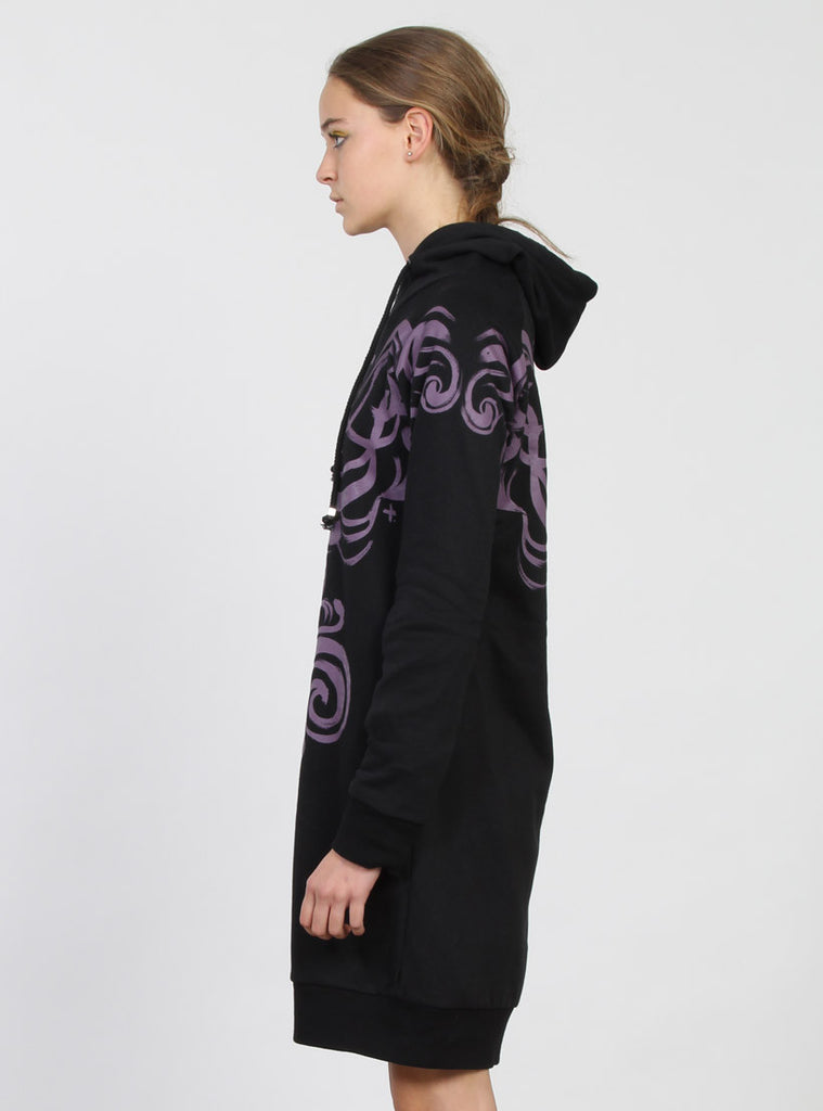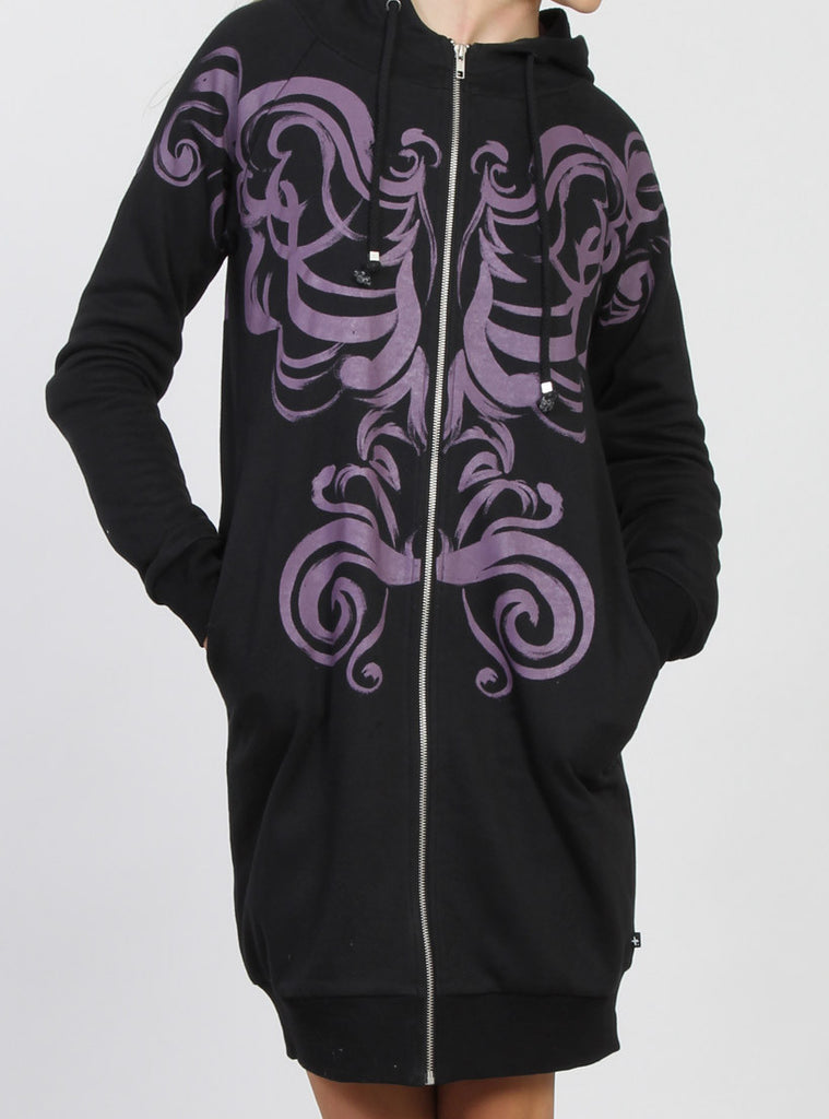 Raglan sleeve oversized long women's hoodie, featuring renaissance inspired brush stroke placement print on upper front, sleeve and back of hoodie. Drawstring hood with metal +. toggle ends, center front open ended metal zip. Curved side seam pockets. 2x2 cotton rib hem and cuffs. +. Pip in left side seam.