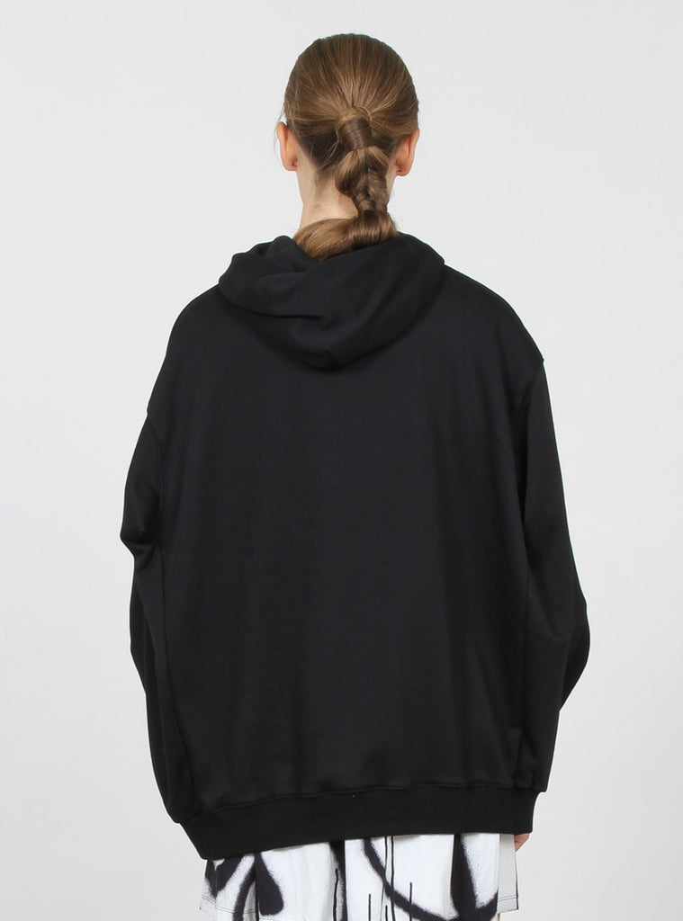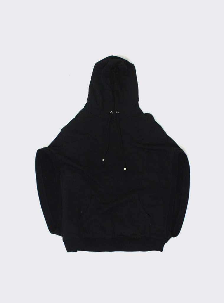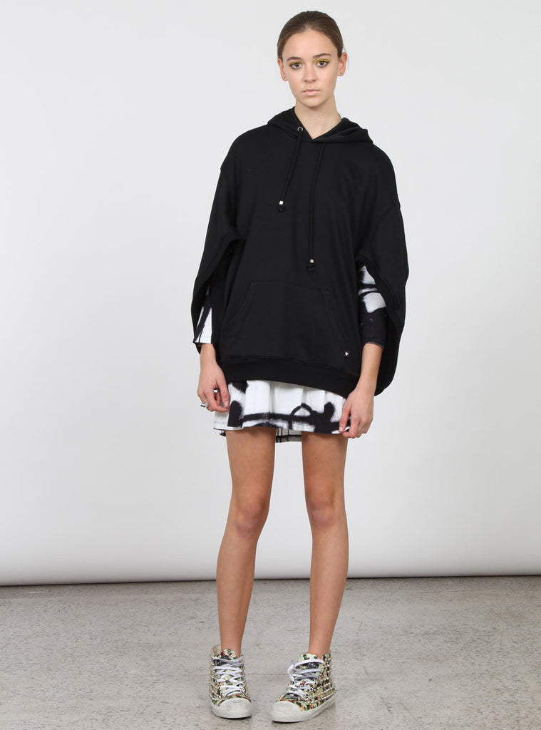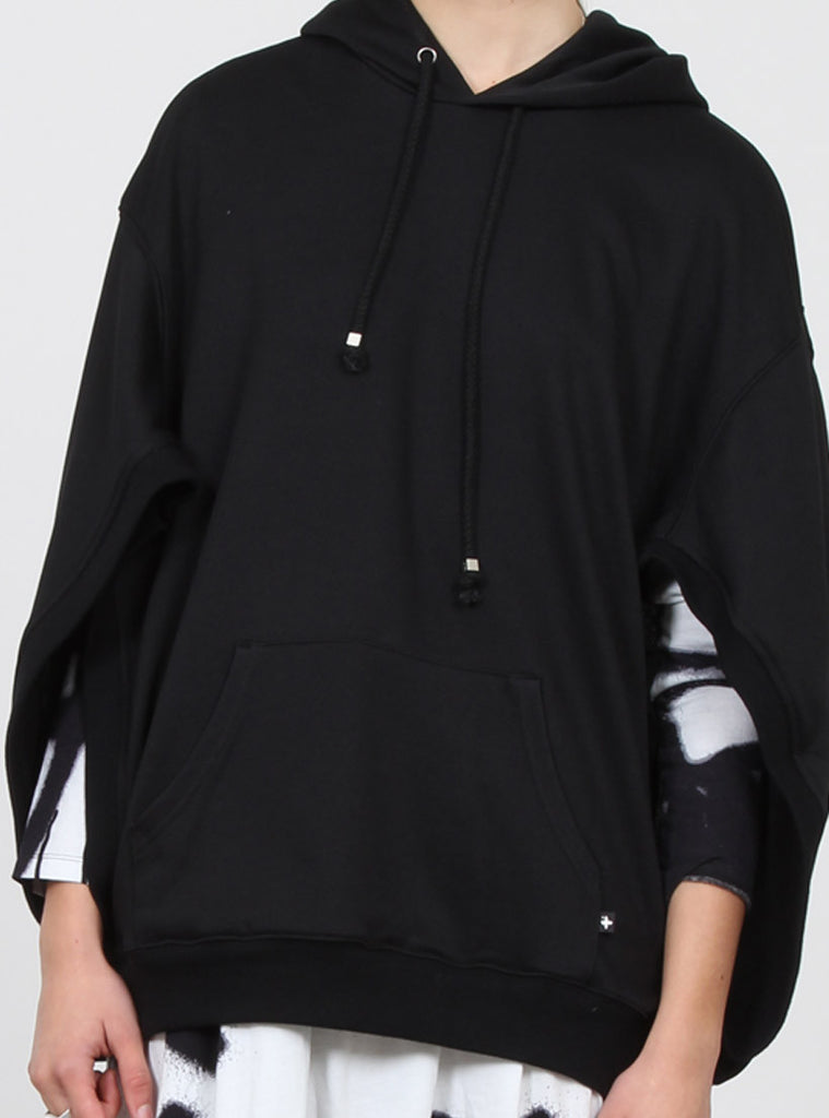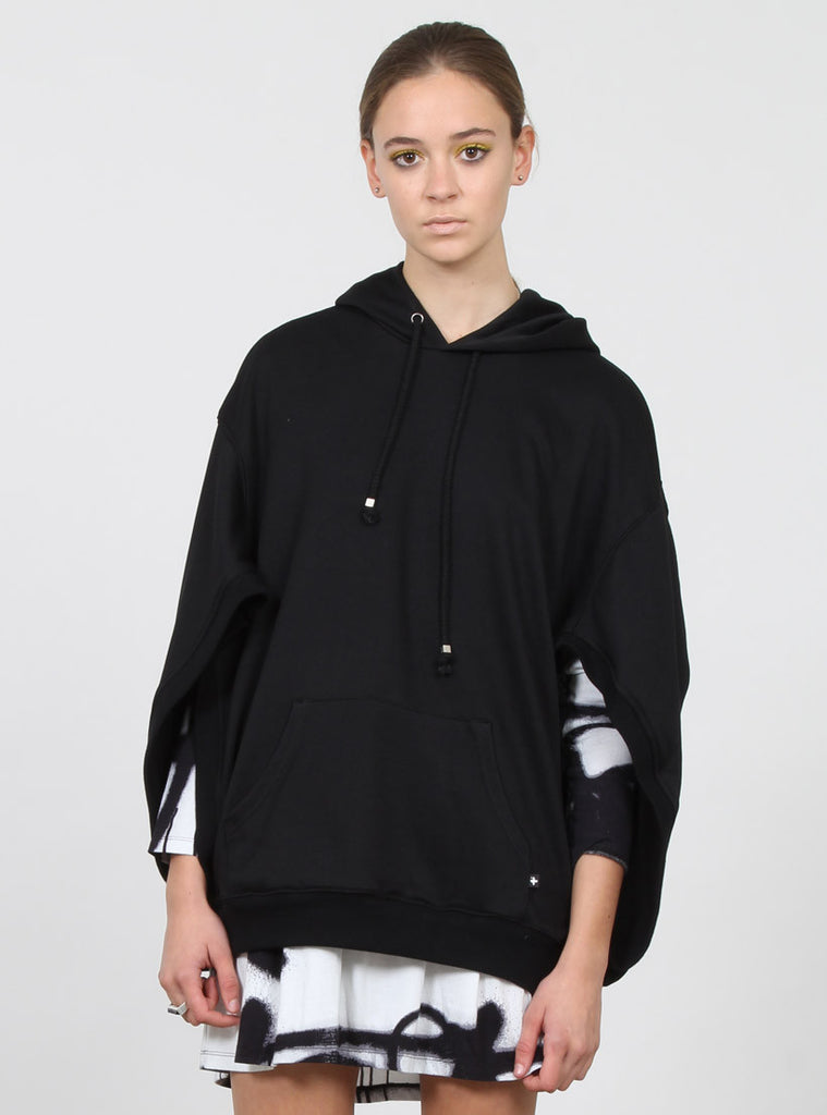Hooded sweatshirt cape with welt edged arm slits and front kangaroo pocket.