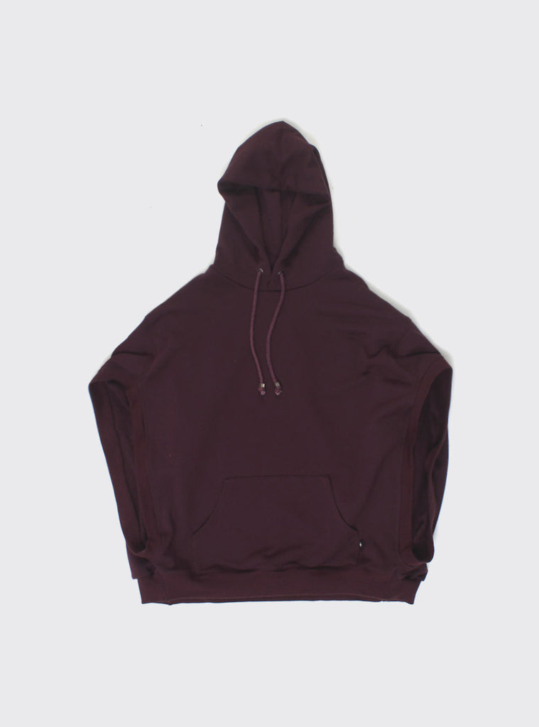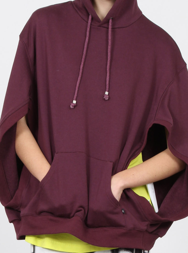 Hooded sweatshirt cape with welt edged arm slits and front kangaroo pocket.