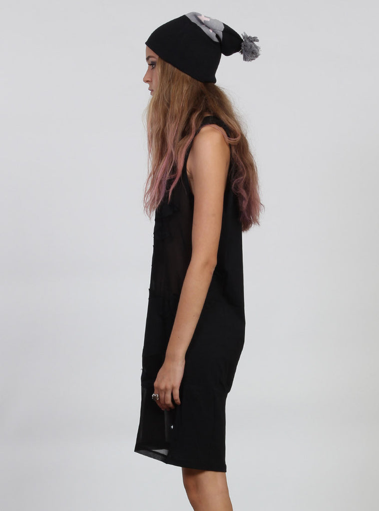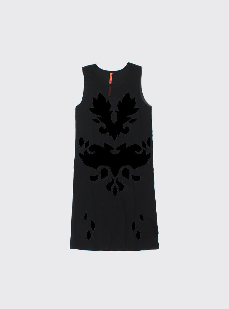 Fitted sleeveless dress, mid length with mesh front and sleeve, jersey back. Mesh panels featuring contrastng applique design.