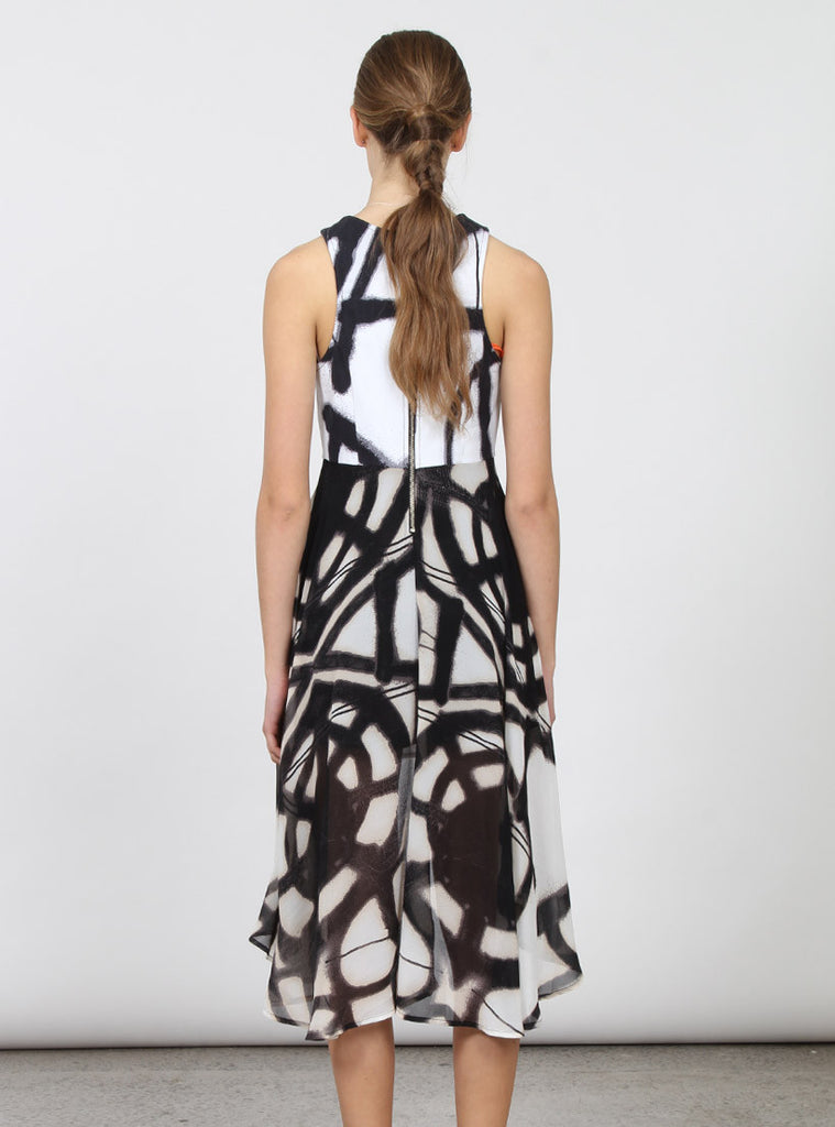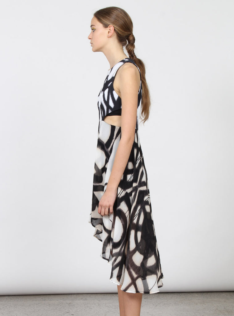 Mid length dress. Fitted denim panelled bodice iwth waist cut out detailing. Flared chiffon skirt with dipped hem. Centre back metal exposed zip opening. +. Pip on left side seam.