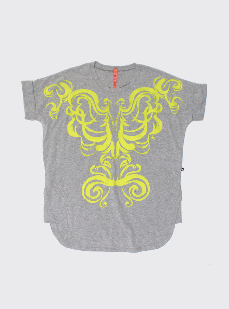 Relaxed fit t-shirt dress with cuffed short sleeve. Curved front and back hem with side splits and pockets. Featuring renaissance inspired skelatal shaped brush stroke print on front and back. +. Pip in left side seam.