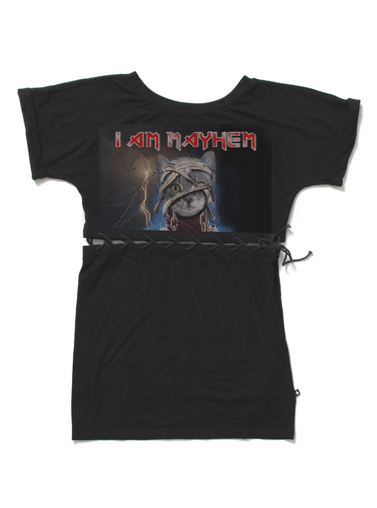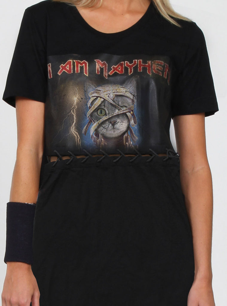 batwing t-shirt dress, relaxed fit with lace up split through waist and short turned up cuffed sleeves and +. pip in left side seam.