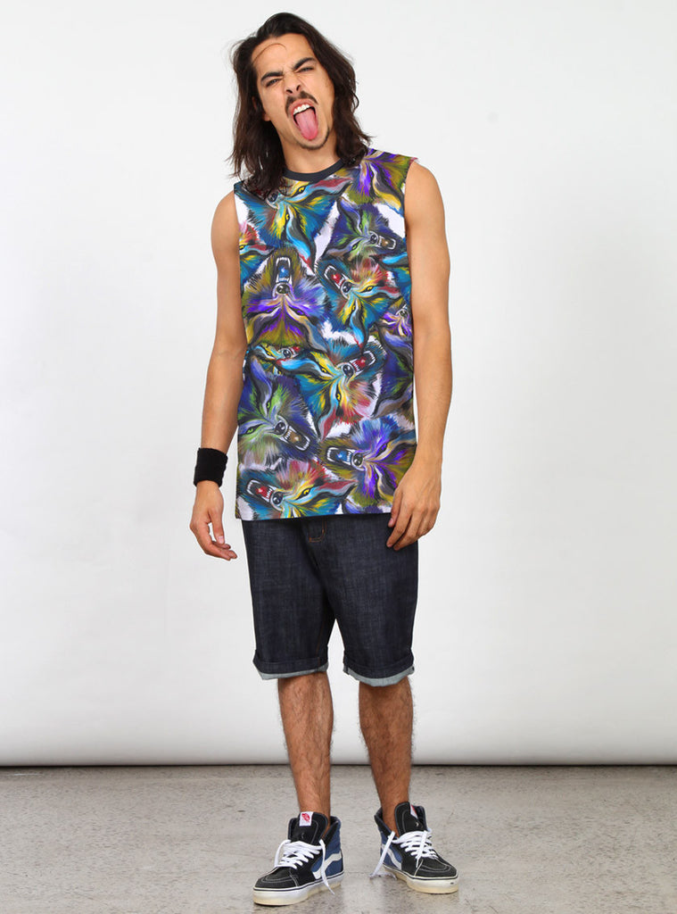 relaxed fit sleeveless tank with raw hemmed armholes +. pip in left side seam