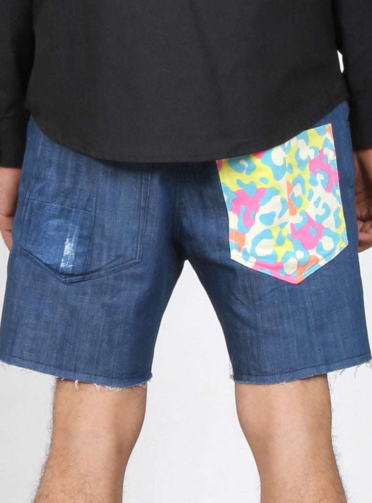 slim leg shorts with disstressing detailing revelaing printed sweatshirting patches underneath. zip fly, in stretch denim. Federation branded embroidery on back waistband, +. Tack button and rivets, and +. Pip on front fob pocket.