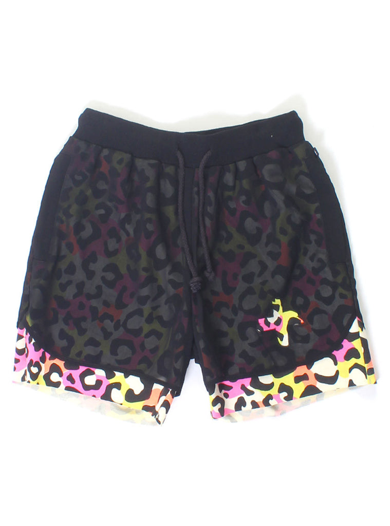 basket ball style womens mid length shorts printed sweatshirting with chiffon overlay. +. Cut out of chiffon layer on left hem revealing printed sweatshirting. Elasticated drawstring waistband and side seam fron pockets.