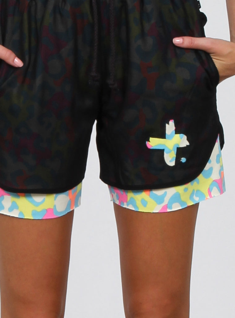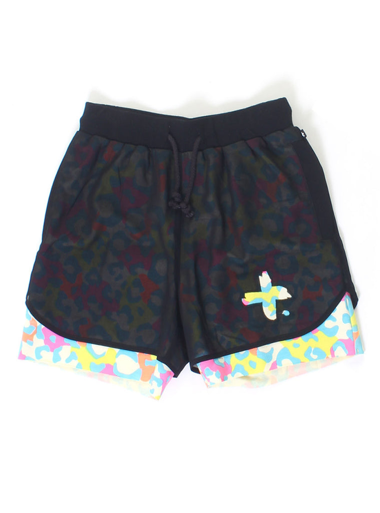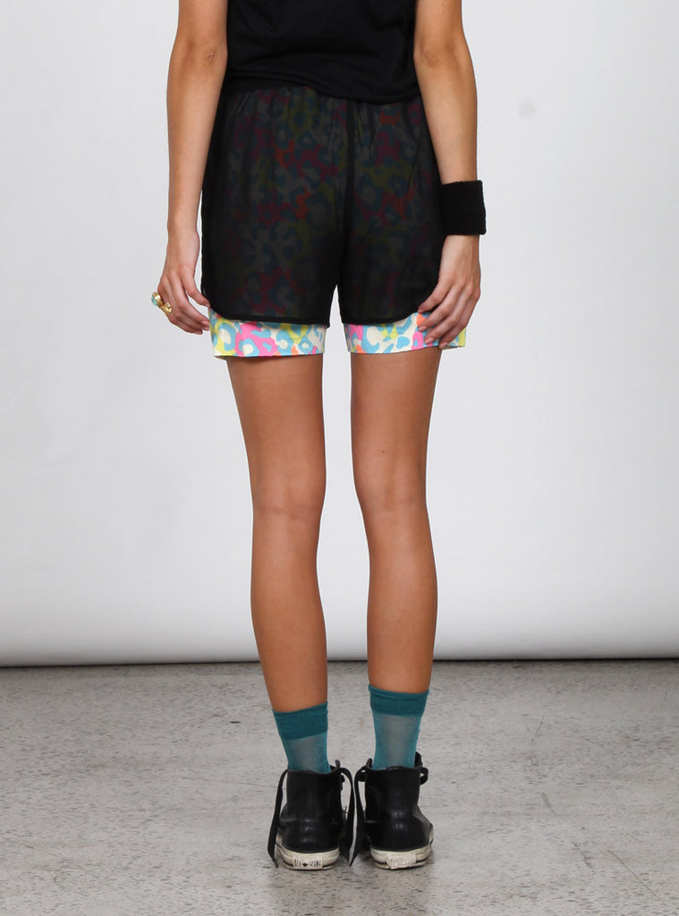 basket ball style womens mid length shorts printed sweatshirting with chiffon overlay. +. Cut out of chiffon layer on left hem revealing printed sweatshirting. Elasticated drawstring waistband and side seam fron pockets.