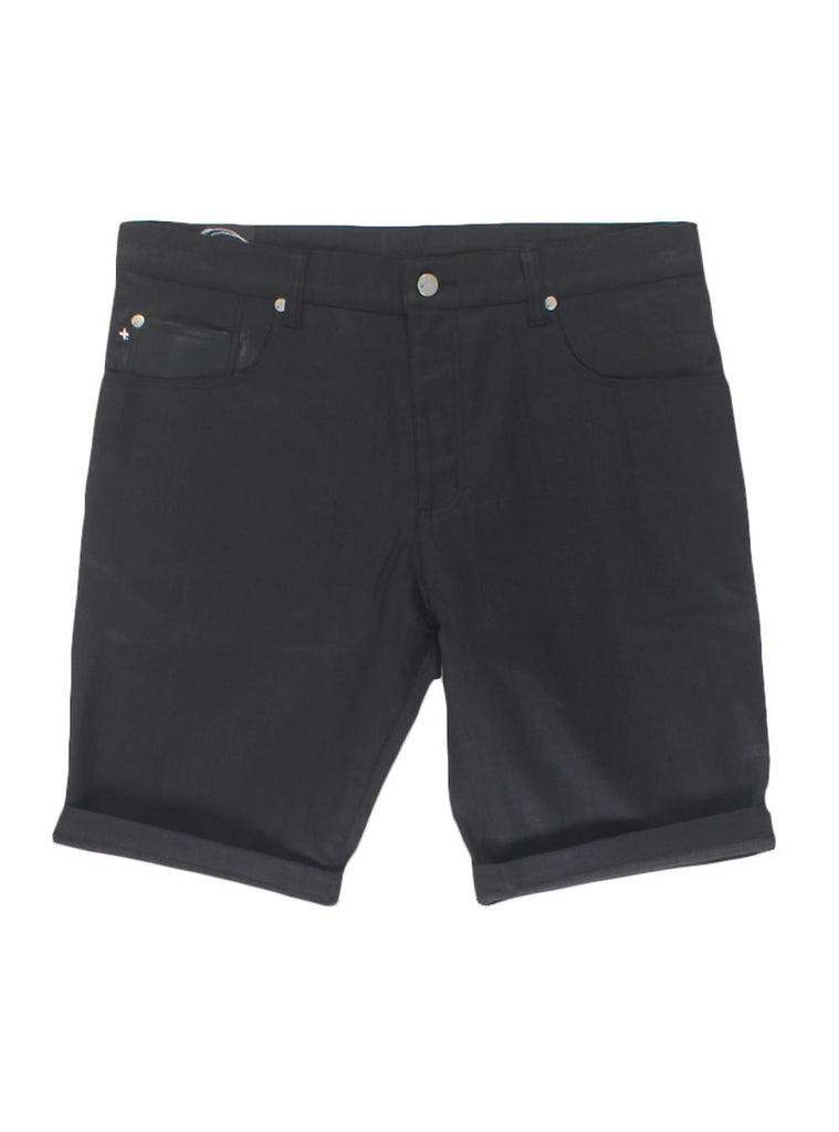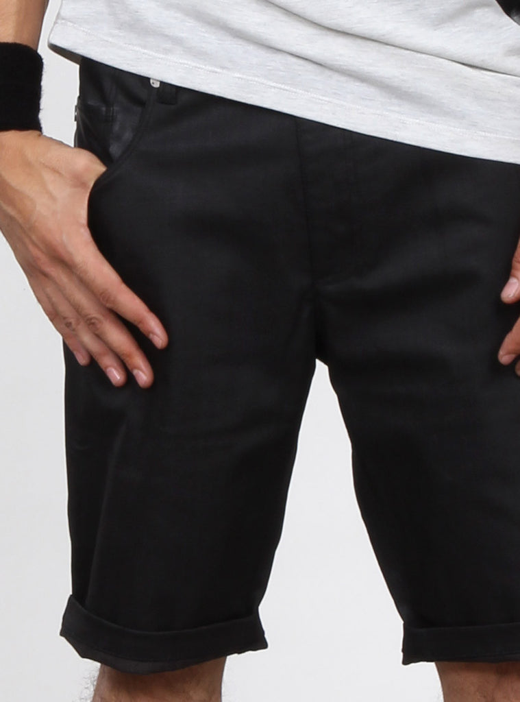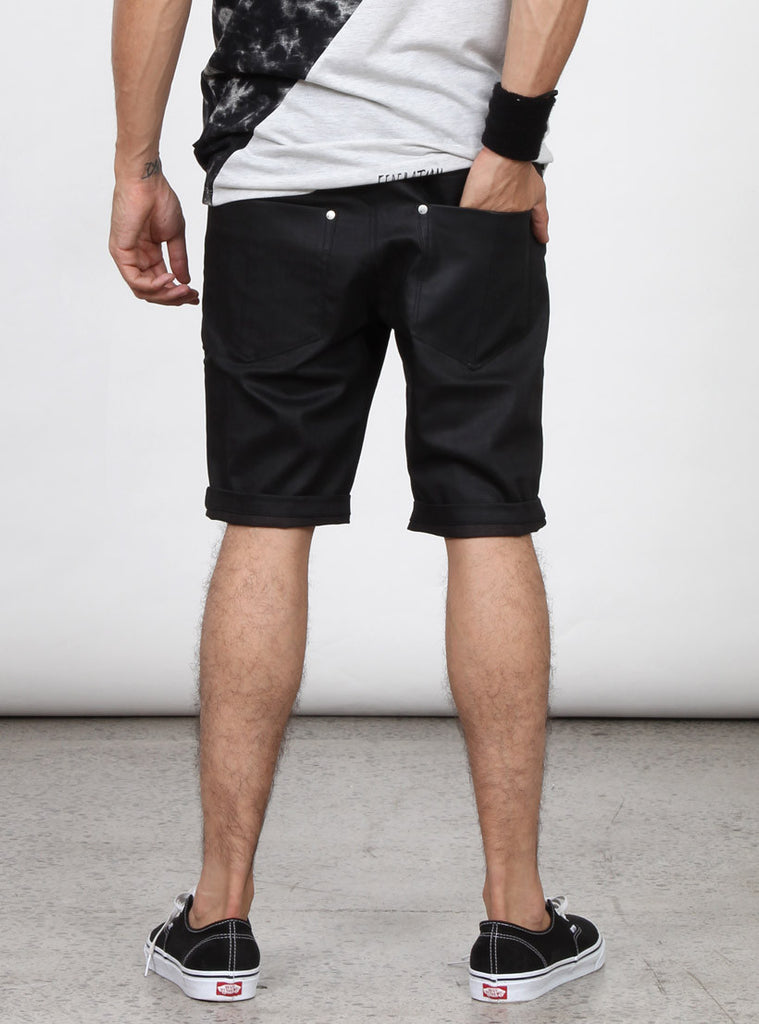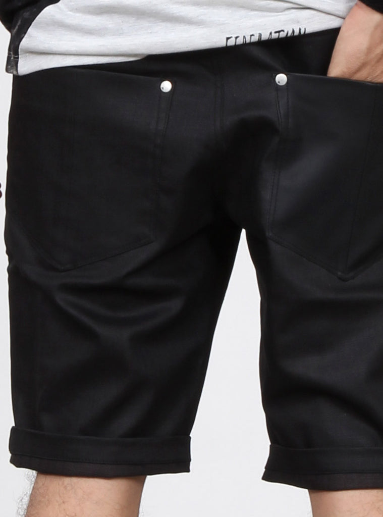 men's slim leg shorts, contrasting leather like back pocket and front fob pocket, turned up hem and zipper fly front, in stretch denim. Federation branded embroidery on back waistband, +. Tack button and rivets, and +. Pip on front fob pocket with custom