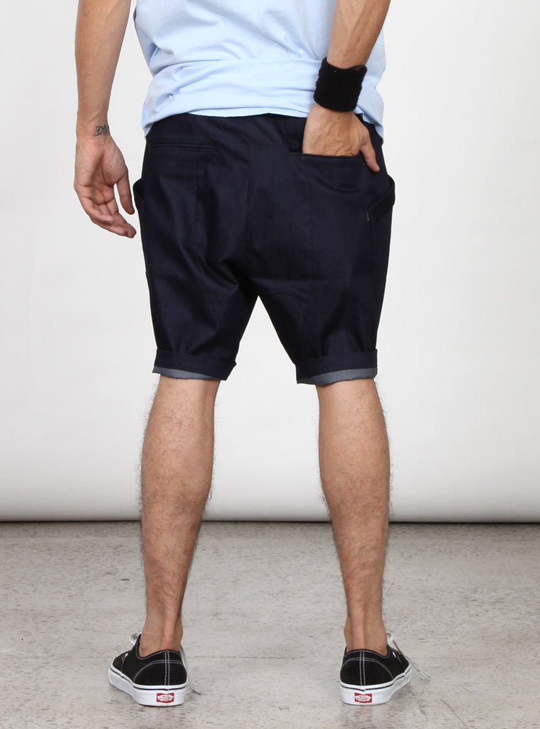 Drop crotch light weight shorts with zipper fly front. featuring two over sized side pockets with plus dot pip on left side pocket