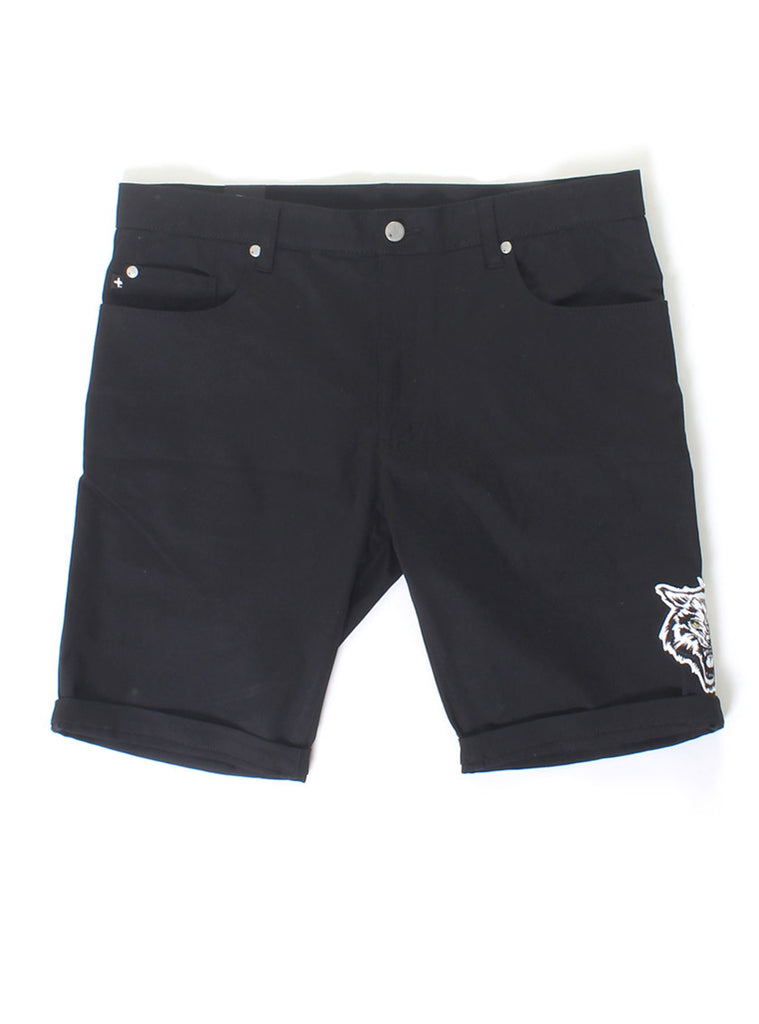Slim leg perfect shorts with zip fly, in stretch denim. Federation branded embroidery on back waistband, +. Tack button and rivets, and +. Pip on front fob pocket. Custom federation double plus printing on back pockets and wolf patch on left leg