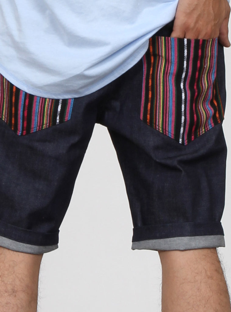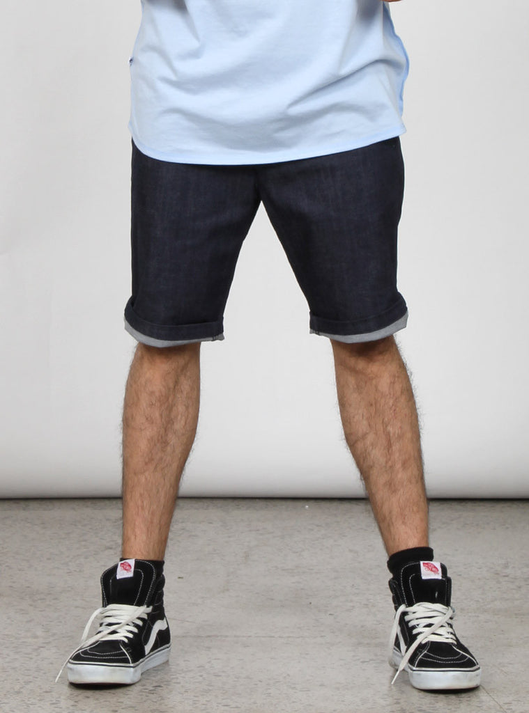 Slim leg perfect shorts with zip fly, in stretch denim. Federation branded embroidery on back waistband, +. Tack button and rivets, and +. Pip on front fob pocket.