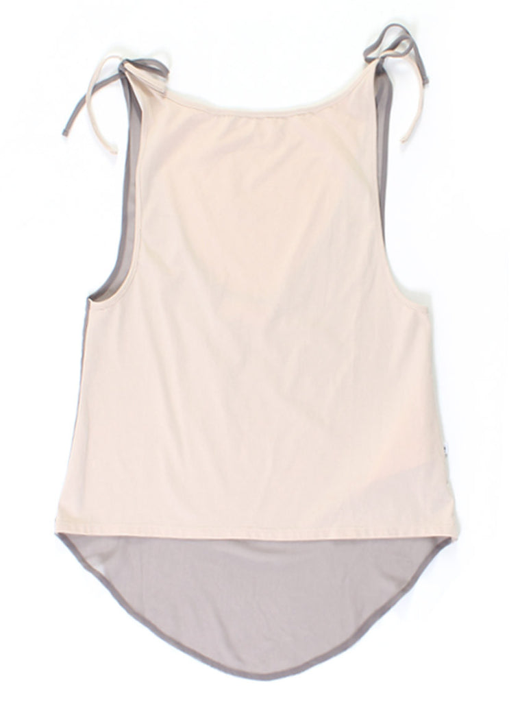 tie up shoulder singlet with high low hem. low cut armholes and back. Front in jersey and back in sheer chiffon. +. pip in left side seam