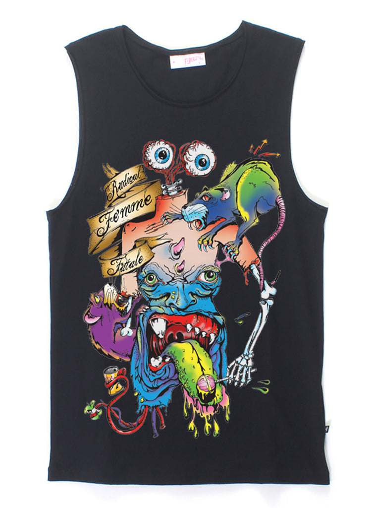 relaxed fit, long length womens sleeveless tank. raw edged binding on neckline and armholes. +. pip in left side seam and custom Federation ""i am mayhem"" print on front.