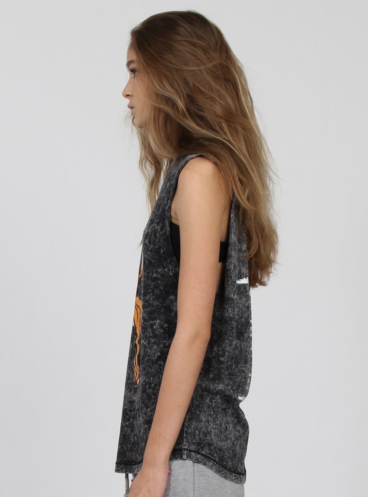 Cut away tank, relaxed fit with raw armholes and +. Pip in left side seam customer federation print on centre front.