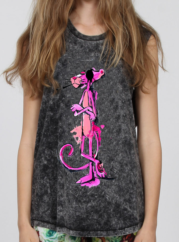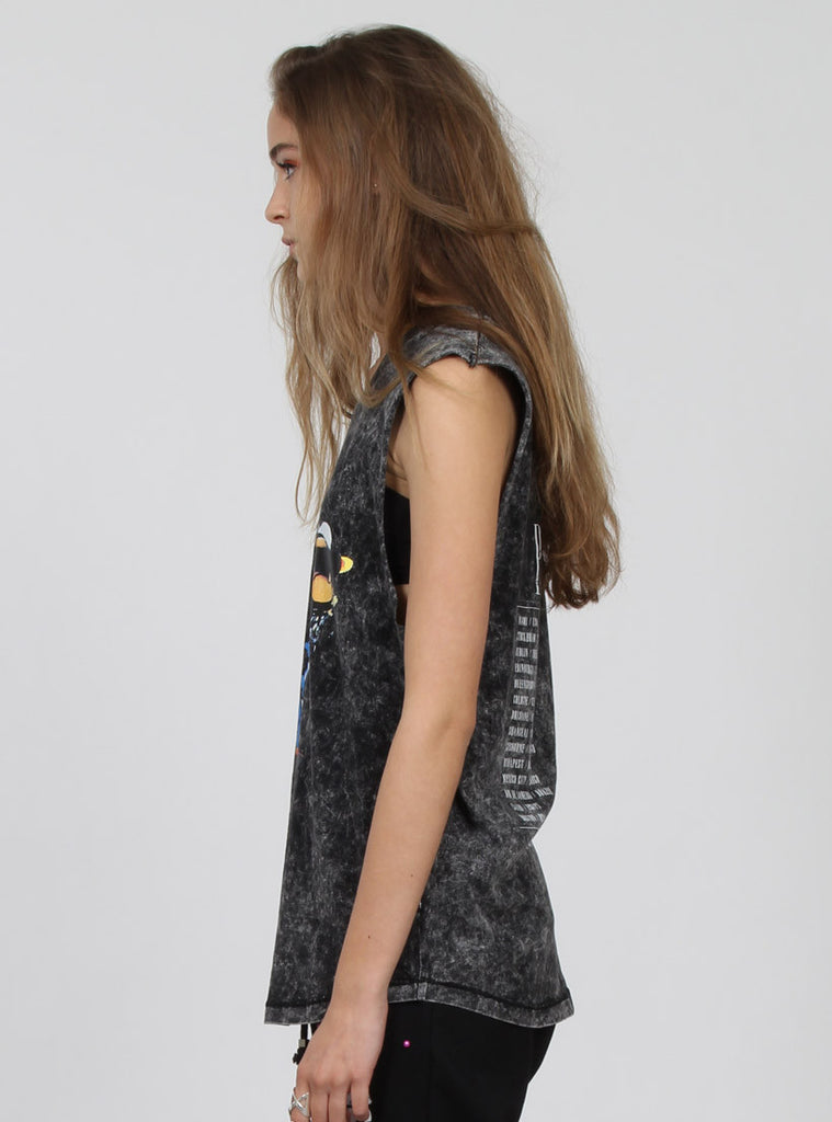 Cut away tank, relaxed fit with raw armholes and +. Pip in left side seam customer federation print on centre front.