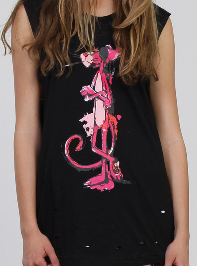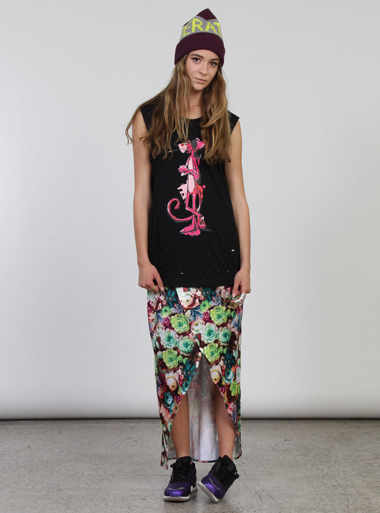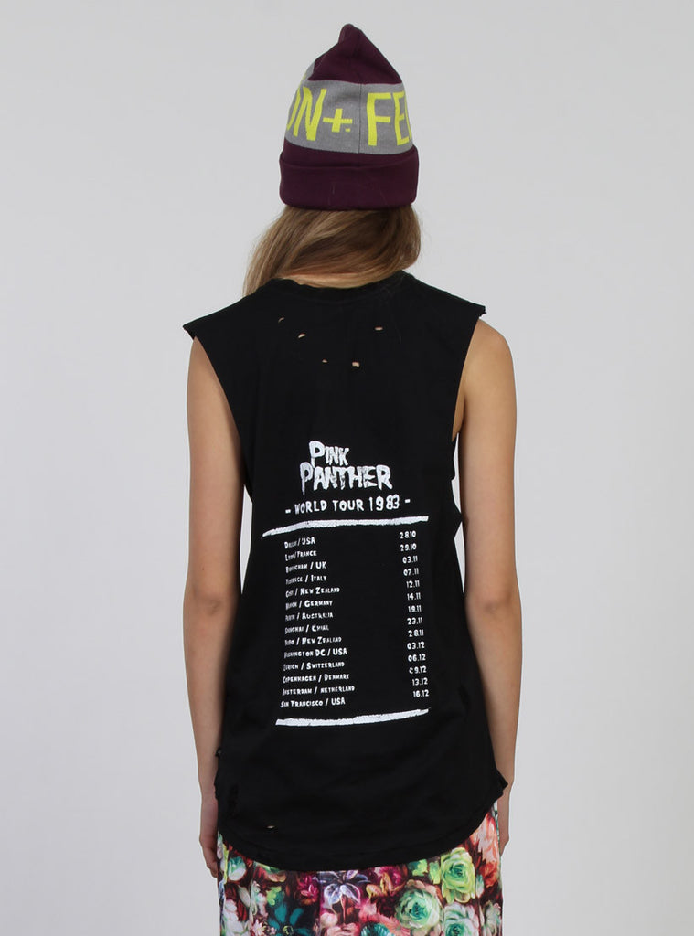 Cut away tank, relaxed fit with raw armholes and +. Pip in left side seam customer federation print on centre front.