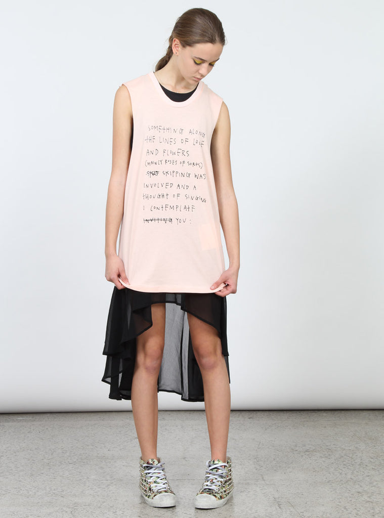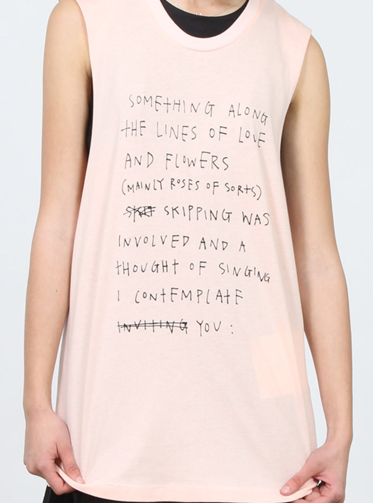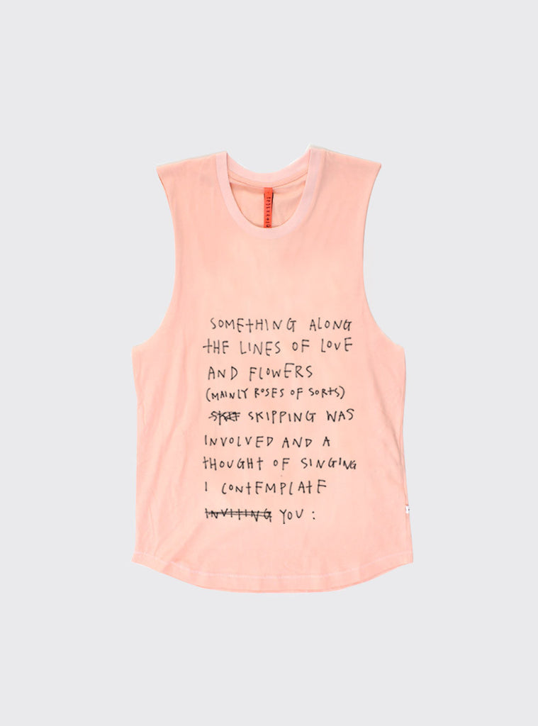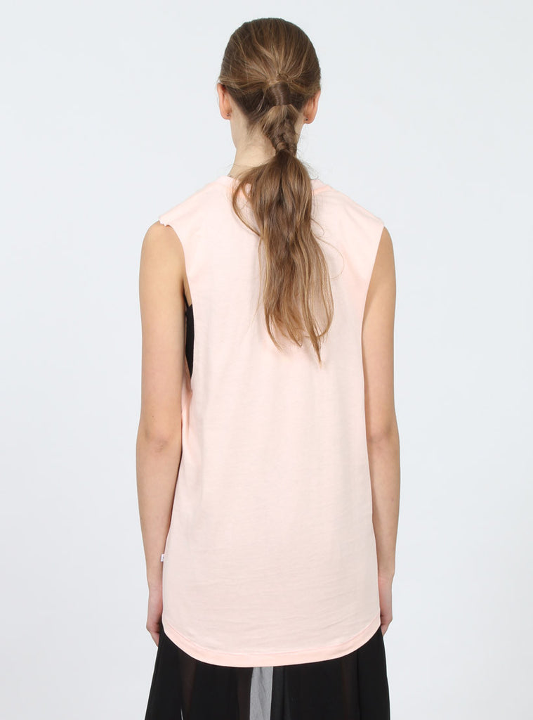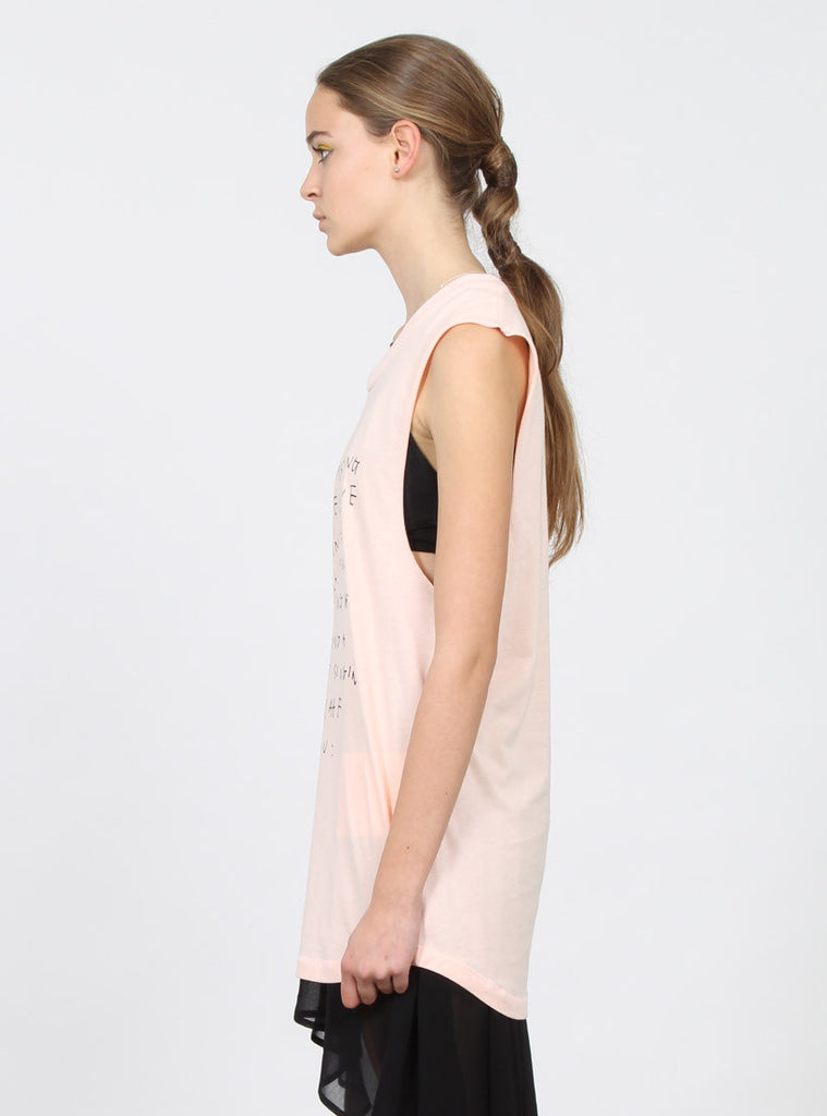 Cut away tank, relaxed fit with raw armholes, printed front and +. pip in left side seam.