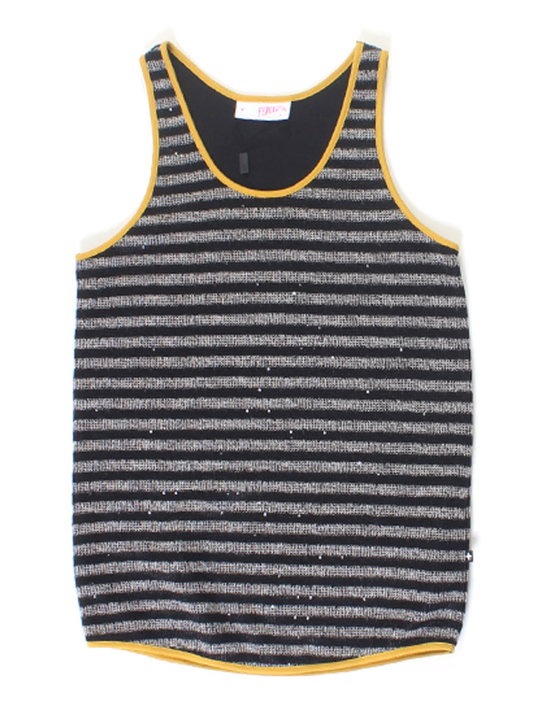 relaxed fit, scoop neck womens singlet. stripe knit with lurex thread and sequin detailing. neck, hem and armholes bound in contrast with +. pip in left side seam