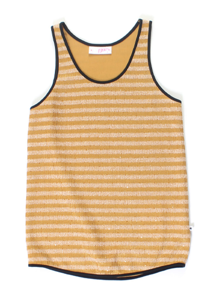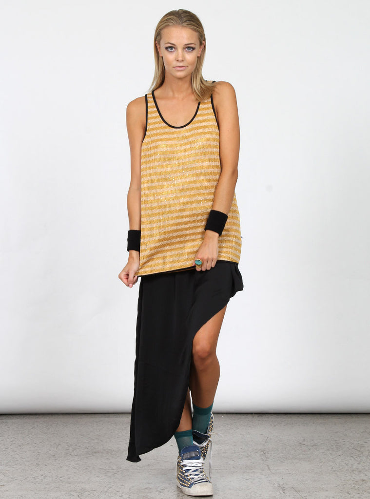 relaxed fit, scoop neck womens singlet. stripe knit with lurex thread and sequin detailing. neck, hem and armholes bound in contrast with +. pip in left side seam
