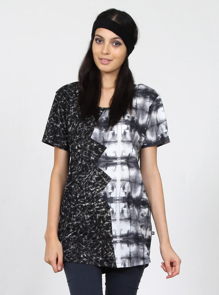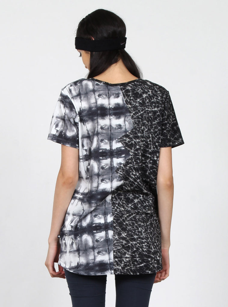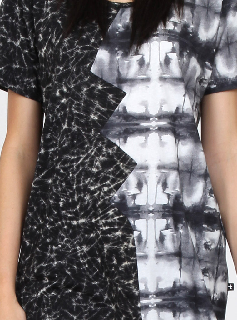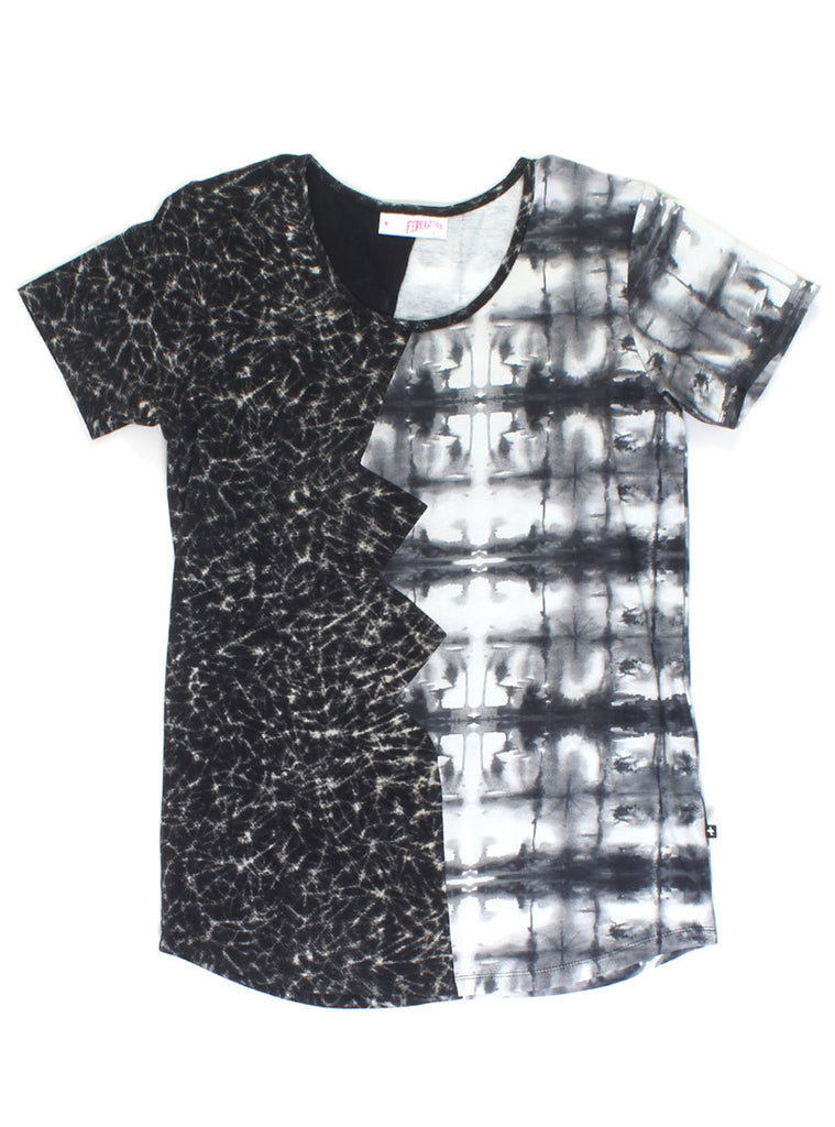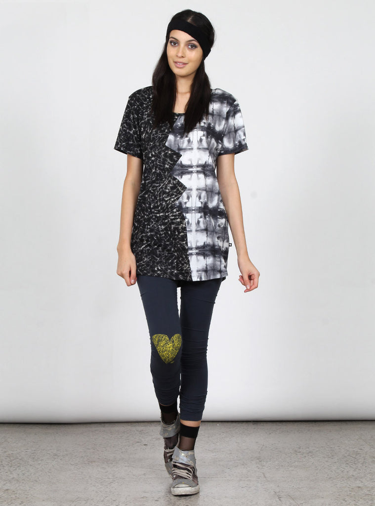 relaxed fit short sleeve tee with contrasting left and right panels connecting at broken heart inspired angled seam through centre front and back, +. Pip in left side seam.