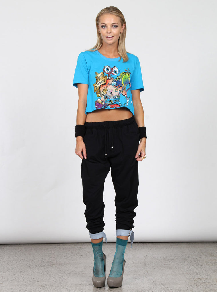 womens cropped tee, relaxed fit with raw hem. featuring federation "eaten print" on front and +. pip in left side seam.