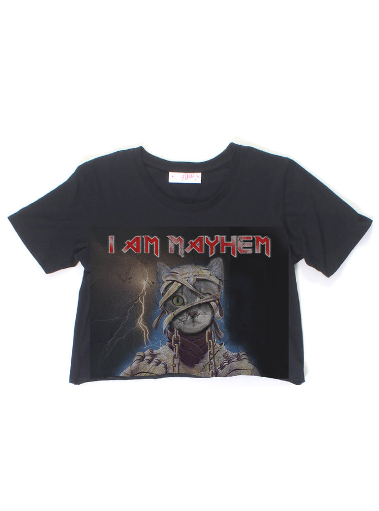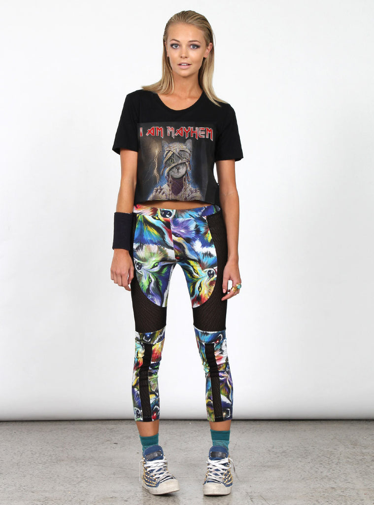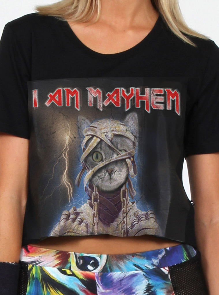 womens cropped tee, relaxed fit with raw hem. featuring federation "eaten print" on front and +. pip in left side seam.