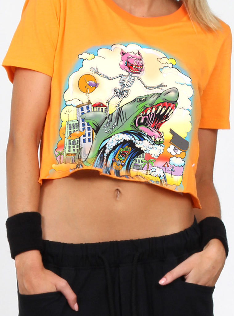 womens cropped tee, relaxed fit with raw hem. featuring federation "eaten print" on front and +. pip in left side seam.