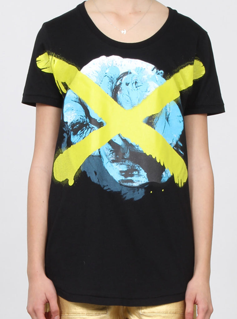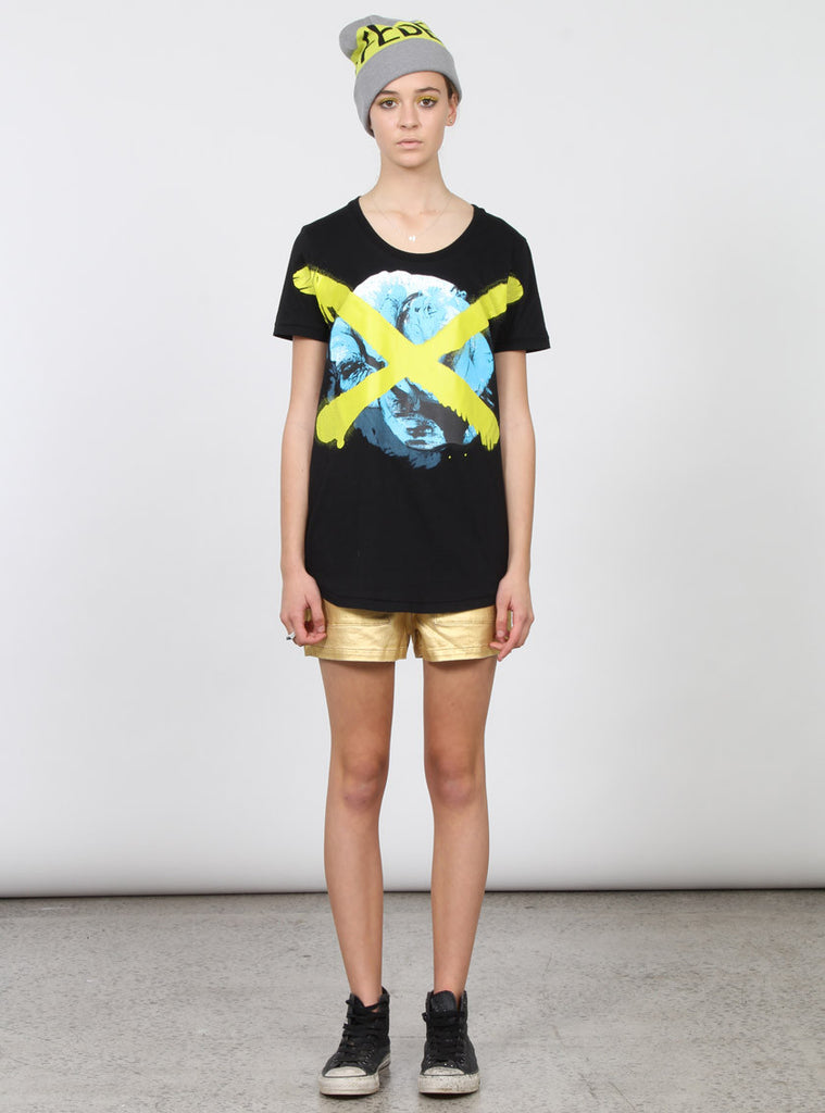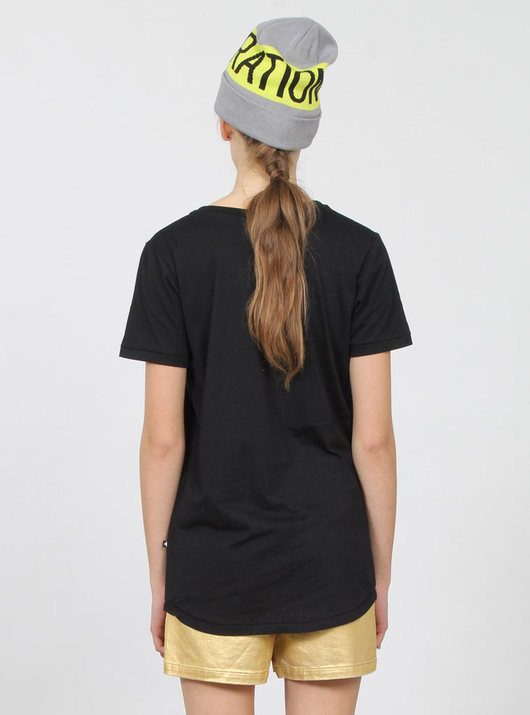 Relaxed fit women's cotton tee, slight scoop hem with grinning stitch hem detail. Featuring custom Federation print on front and +. pip in left side seam.