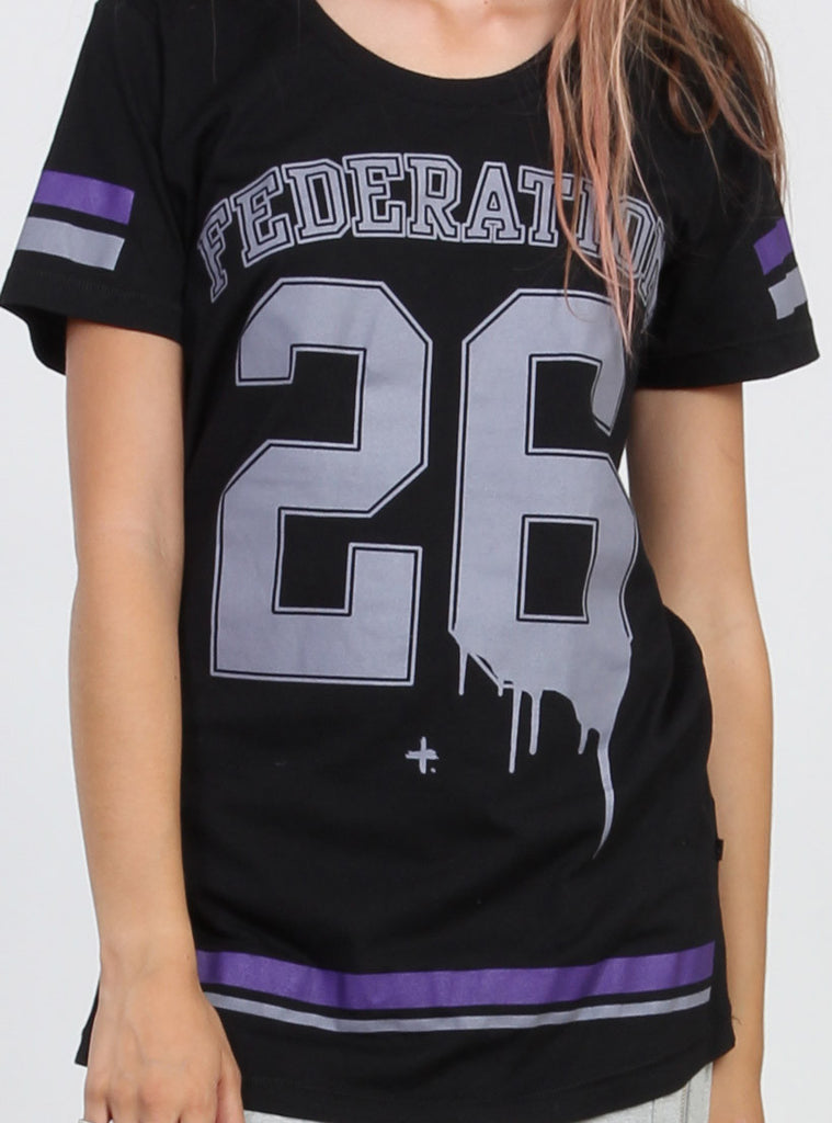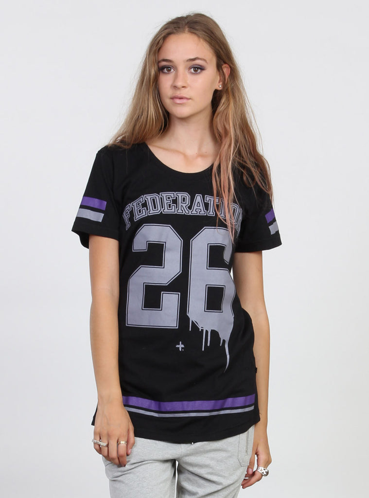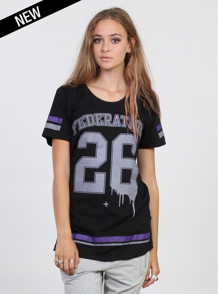 Relaxed fit women's cotton tee, slight scoop hem with grinning stitch hem detail. Featuring custom Federation print on front and +. pip in left side seam.
