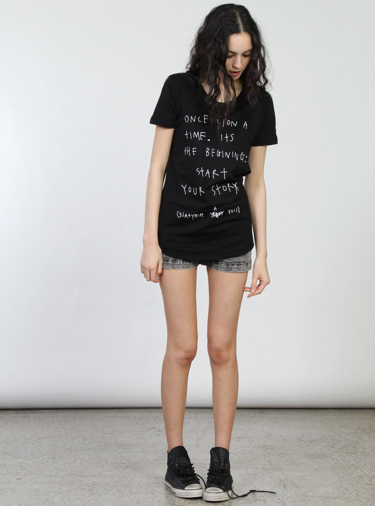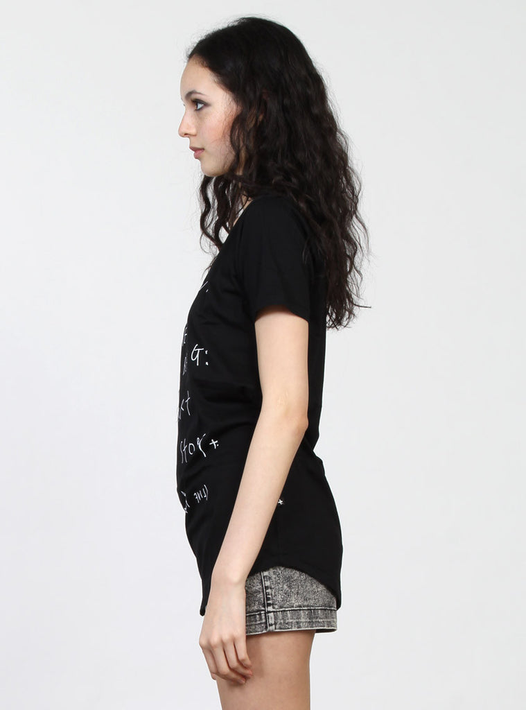 Relaxed fit women's cotton tee, slightly scalloped hem with grinning stitching hem detail. Featuring custom Federation print on front and +. Pip in left side seam