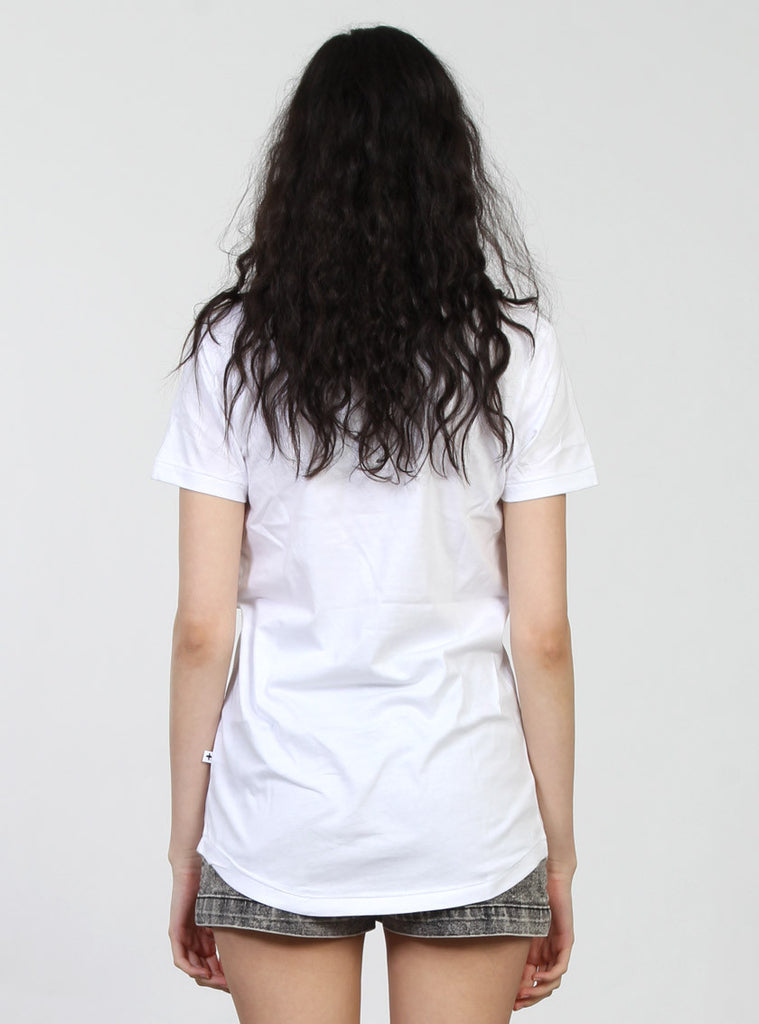 Relaxed fit women's cotton tee, slightly scalloped hem with grinning stitching hem detail. Featuring custom Federation print on front and +. Pip in left side seam