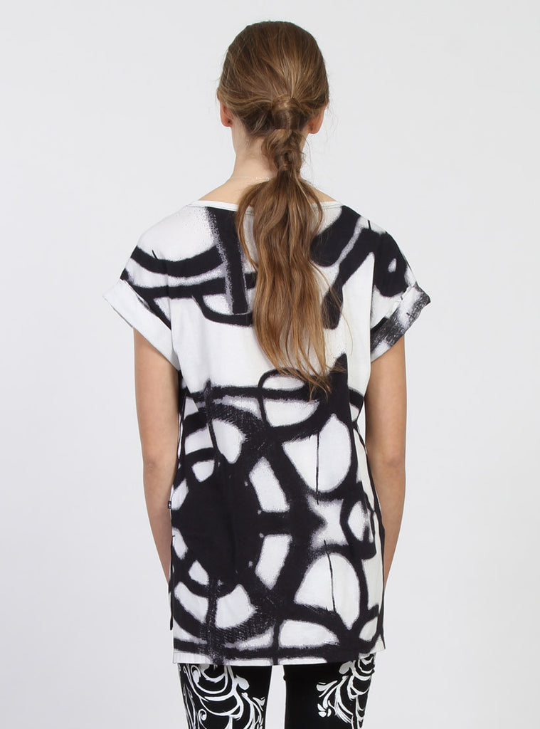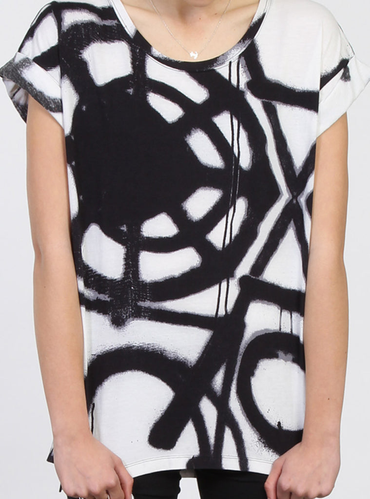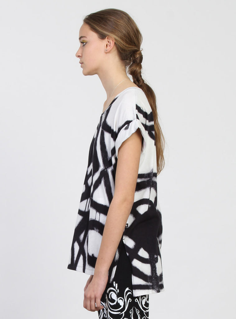Women's short sleeve relaxed fit tee with cuffed and tacked sleeves. Round neck featuring raw edge binding detailing, two side splits and a stepped subtle drop tail. Printed front and +. pip in the left side seam.
