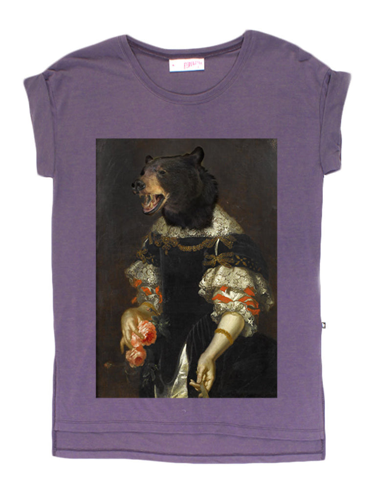 Women's short sleeve relaxed fit tee with cuffed and tacked sleeves. Round neck featuring raw edge binding detailing, two side slits and a stepped subtle drop tail +. In left side seam. Federation custom print pm centre front.