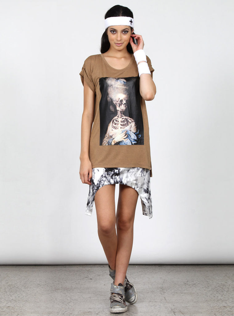 Women's short sleeve relaxed fit tee with cuffed and tacked sleeves. Round neck featuring raw edge binding detailing, two side slits and a stepped subtle drop tail +. In left side seam. Federation custom print pm centre front.
