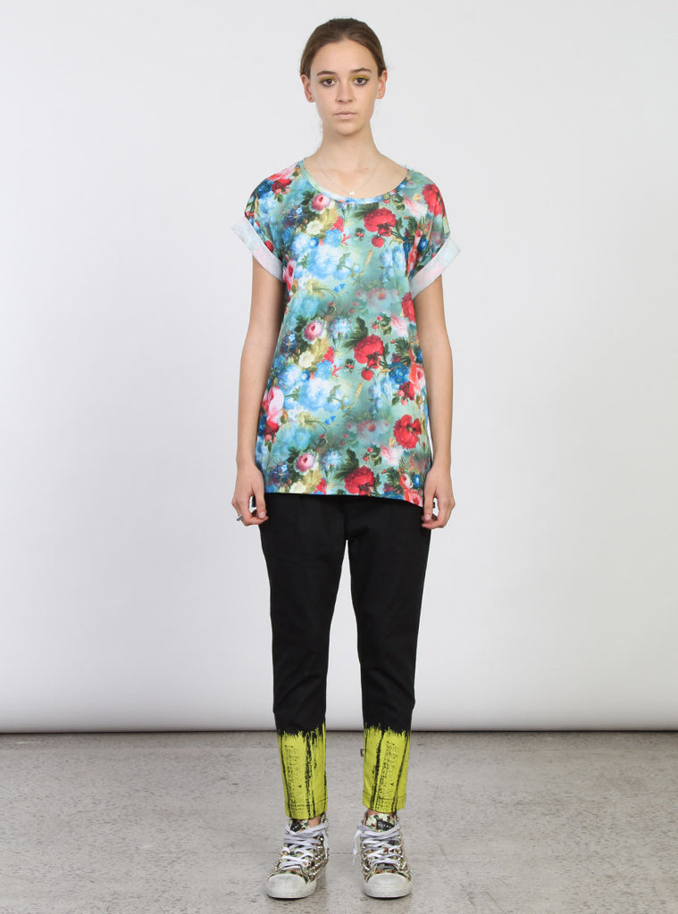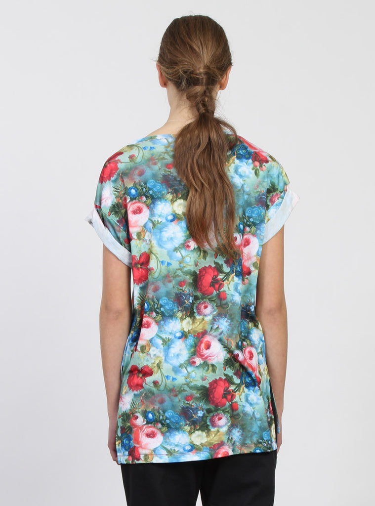 Women's short sleeve relaxed fit tee with cuffed tacked sleeves. Round neck featuring raw edge binding detailing, two side slits and a stepped subtle drop tail. +. Pip in left side seam.