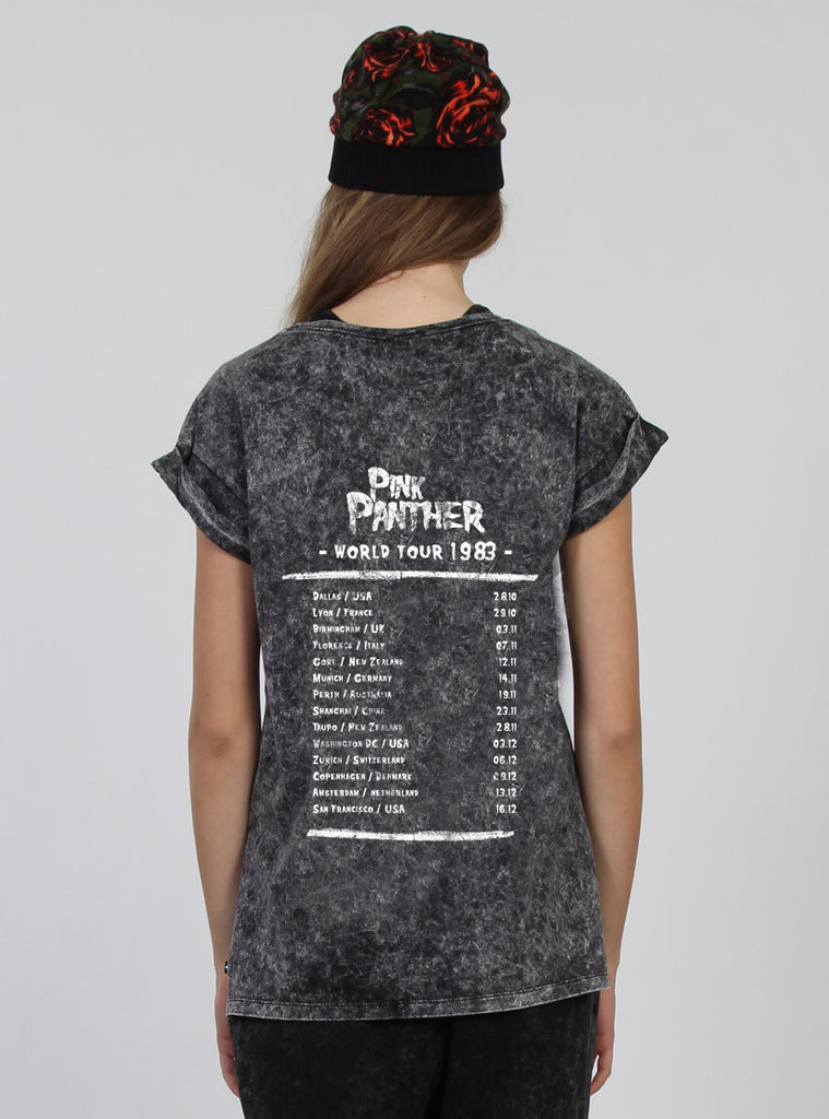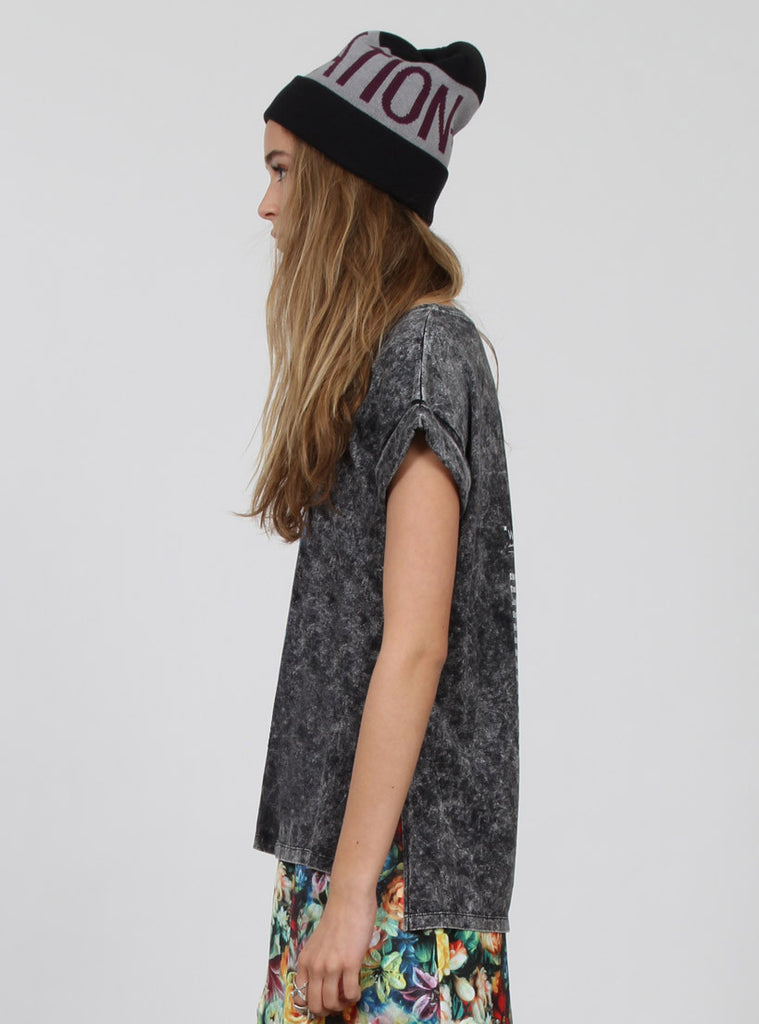 Womens short sleeve relaxed fit tee with cuffed and tacked sleeves. Round neck featuring raw edge binding detailing, two side slits and a stepped subtle drop tail +. In left side seam. Custom federation print on centre front.