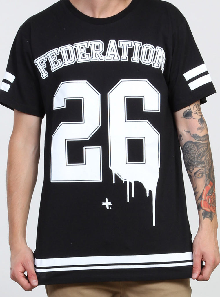 relaxed fit s/s tee with round rib neck. featuring federation custom print on centre front and +. pip in left side seam