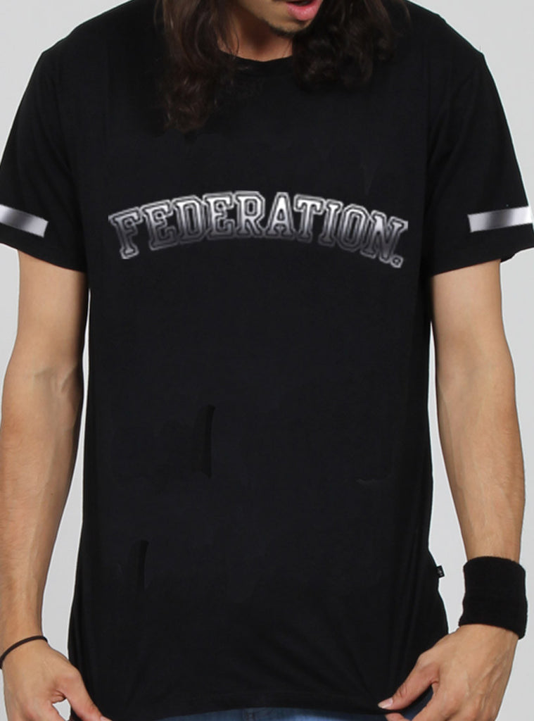 Relaxed fit s/s tee with round rib neck. featuring federation custom print on centre front and +. pip in left side seam