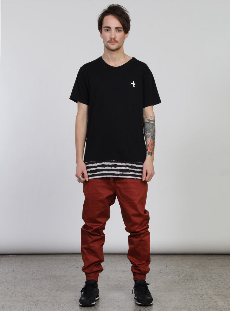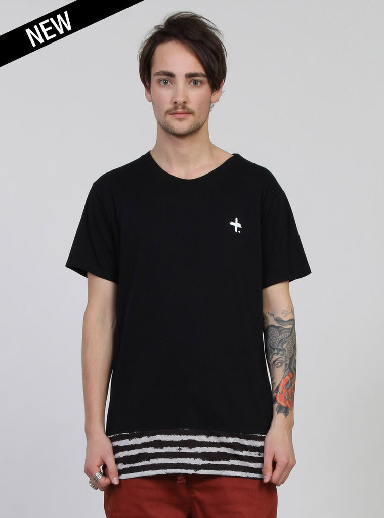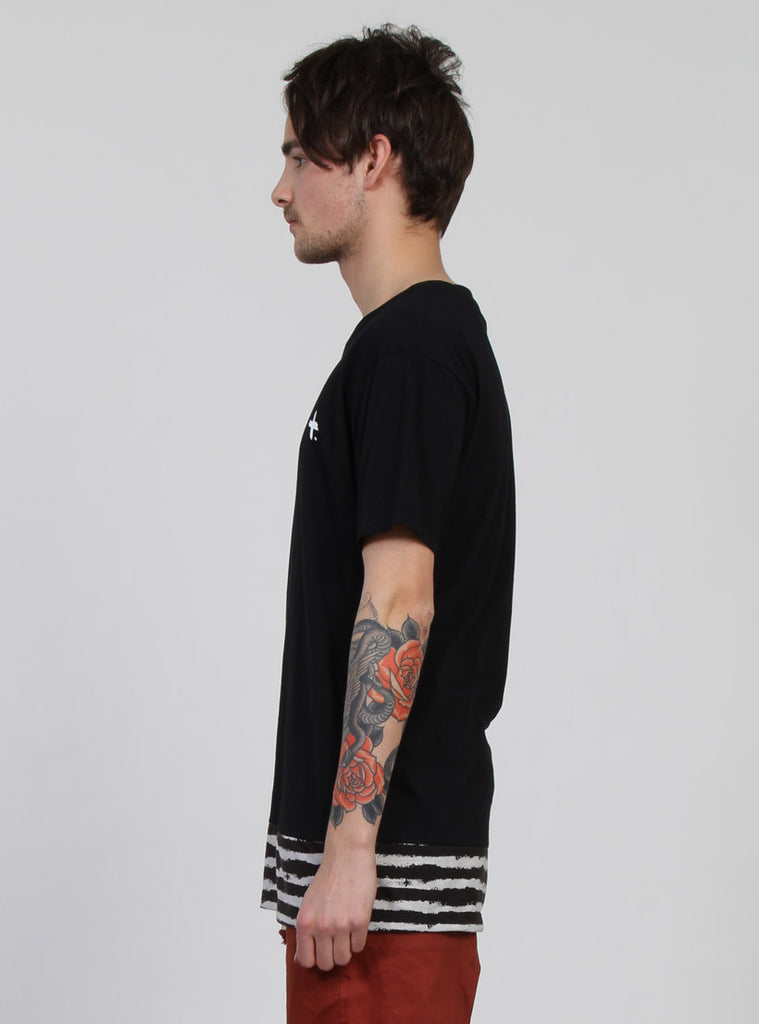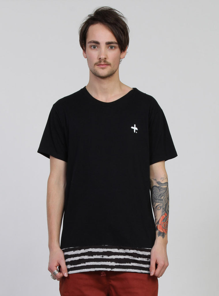 Short sleeve long length tee with 10cm contrasting stripe band around hem. 2x2 rib neck and +. Print on left chest