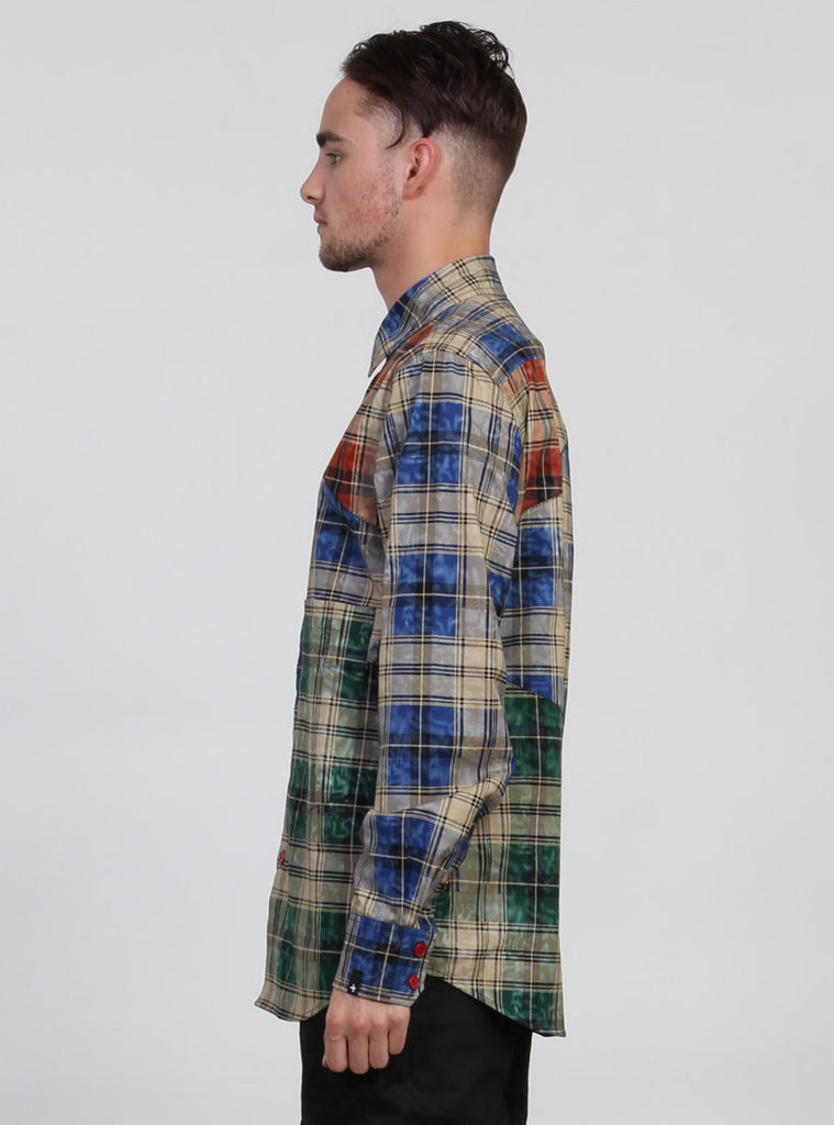 Long sleeve collared button up shirt with contrasting angled check panels. +. Chest print and contrasting buttons.